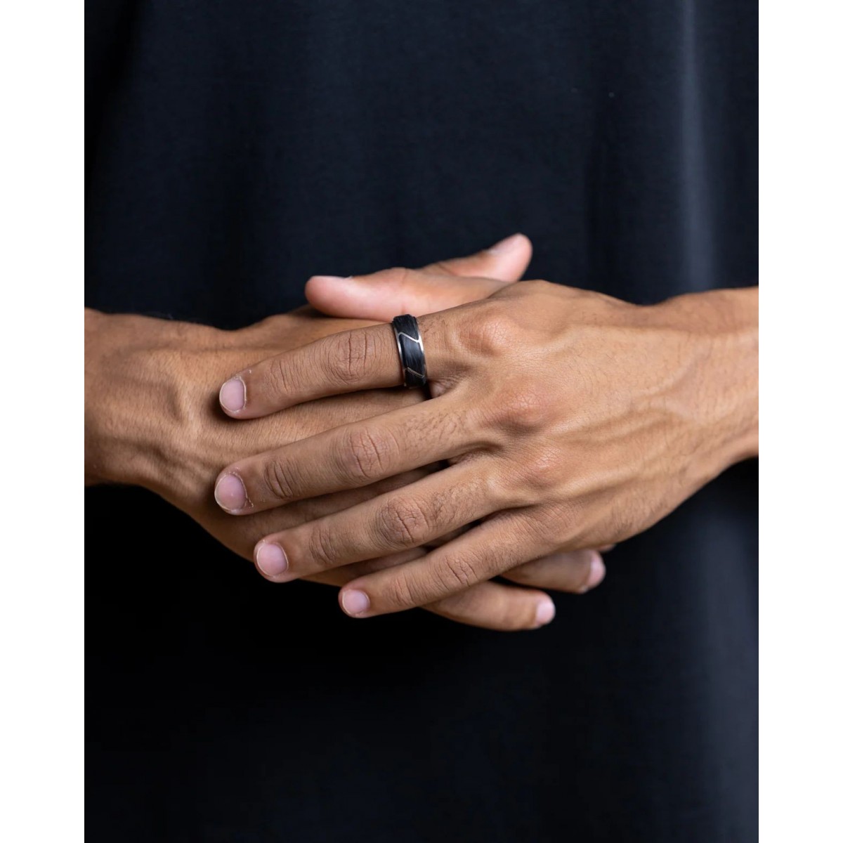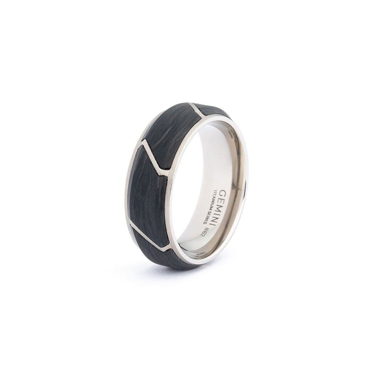 La bague Carus Silver est entièrement composée de titane et de carbone forgé. Les lignes diagonales du titane traversent les structures en fibre de carbone et tout se réunit en une belle pièce.