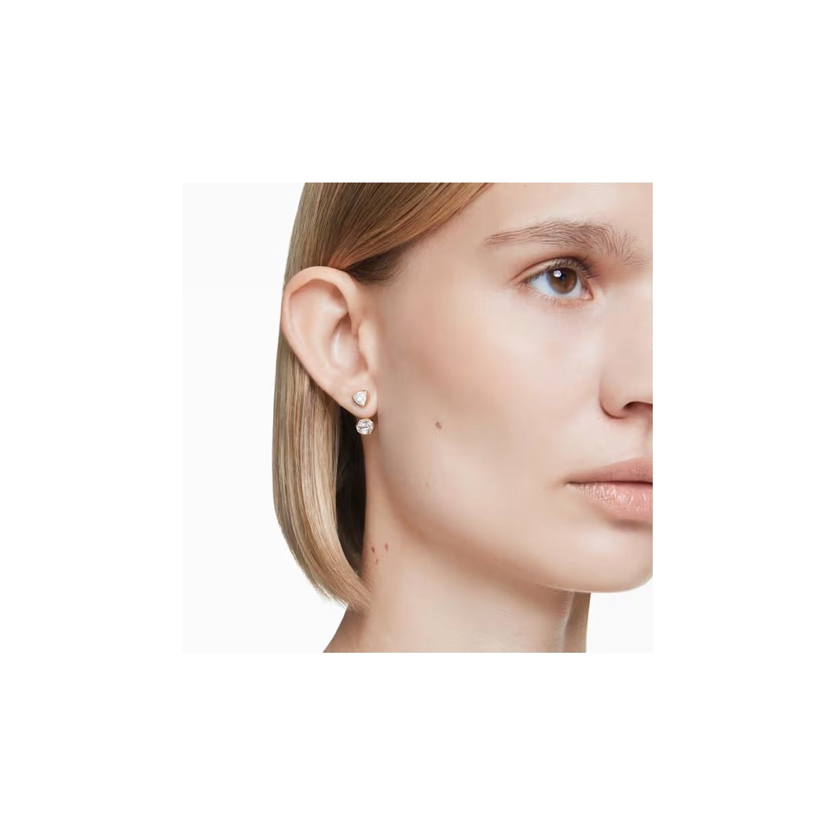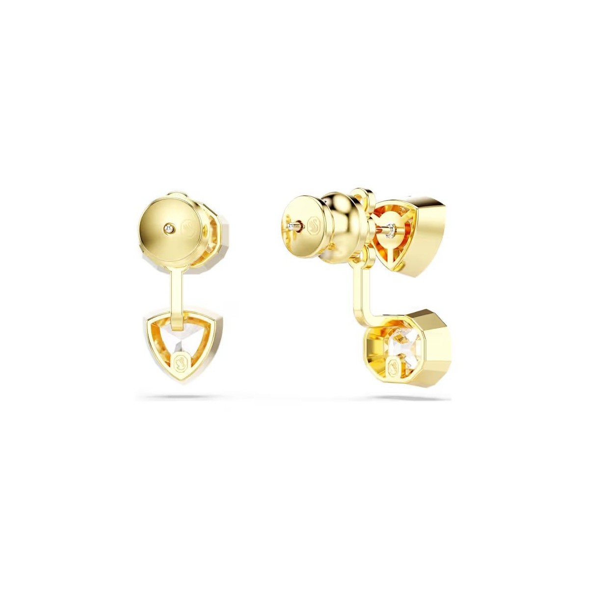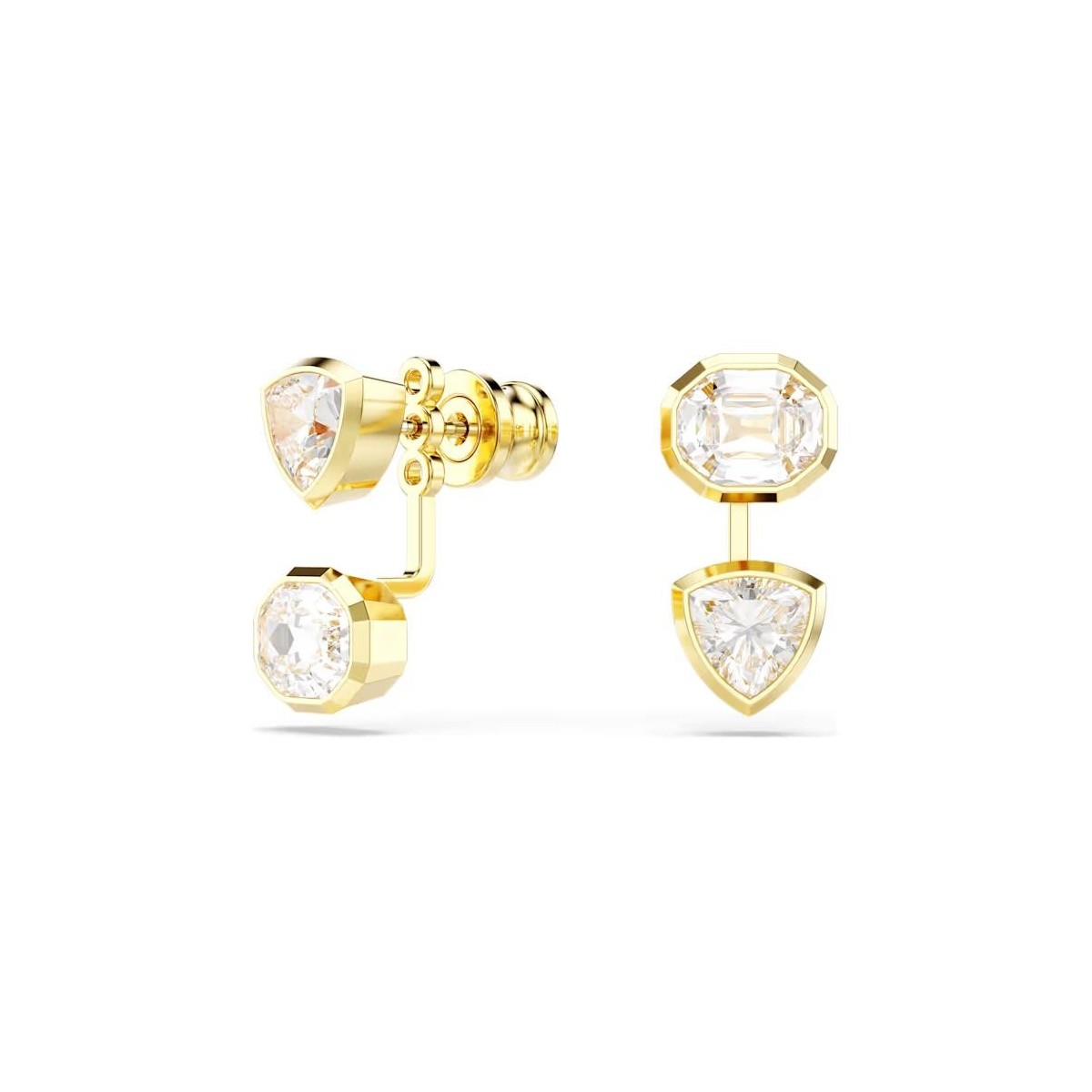 Associant géométrie et lumière, ces intrigantes boucles d'oreilles d'exception affichent un placage de ton or et présentent sur chaque côté une paire de Swarovski Zirconia tailles trillion et octogone. Les pierres incolores reposent dans un sertissage chaton moderne, et pour une touche d'asymétrie, leur position est inversée d'un côté à l'autre. Portez ces boucles d'oreilles avec un collier assorti et laissez votre style au quotidien briller de mille feux.