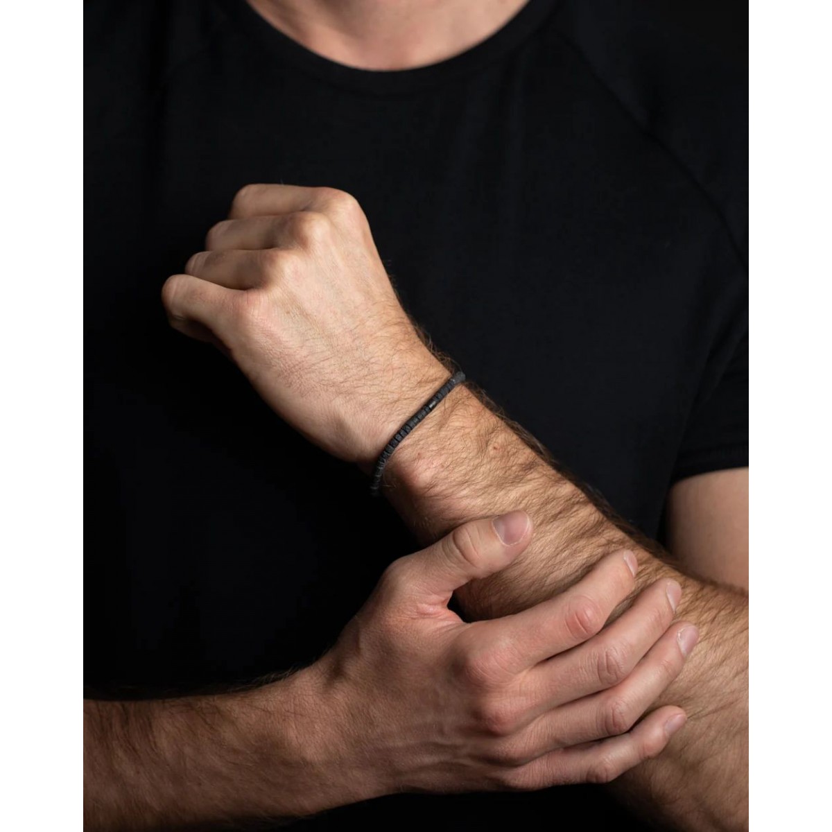 Le bracelet Sphera Black Lava est composé d'élégantes pierres de lave rondes de 2 mm et fini avec un élément en titane. Ce bracelet est raffiné et classe et s'accorde parfaitement avec d'autres accessoires ou montres. La pierre de lave est censée transporter de l'énergie car elle provient littéralement du centre de la Terre. Cette pierre se trouve principalement en Asie et est formée par le magma issu des éruptions volcaniques. Cette pierre a un effet calmant et cicatrisant.