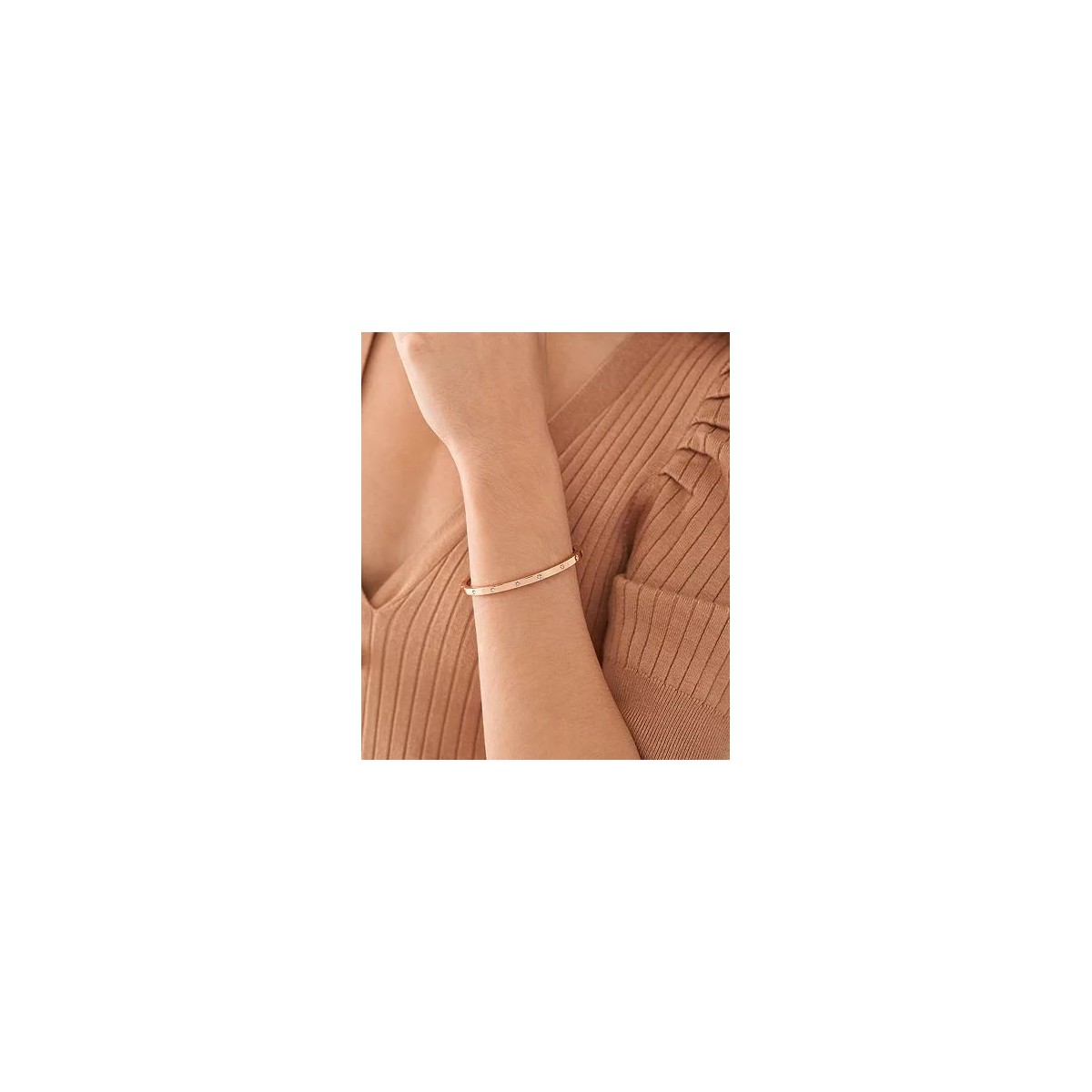 Ce bracelet jonc en acier inoxydable doré rose est doté d'un fermoir à bouton-poussoir.