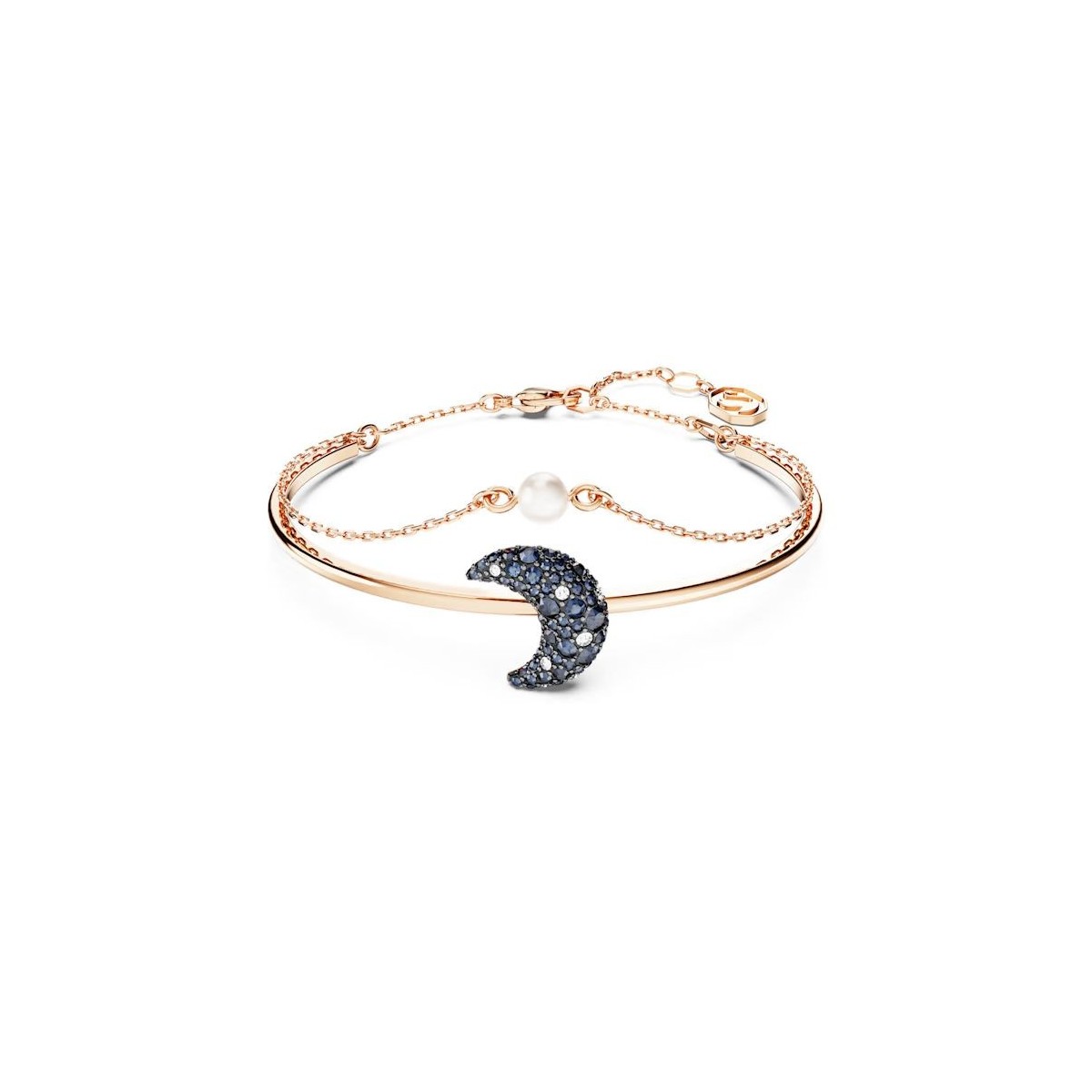 Ce bracelet Luna double tour plein de magie apportera lumière et énergie à toutes vos tenues. Son design élégant présente une chaîne délicate ornée d'une seule perle blanche ajnsi qu'un bracelet-jonc en placage de ton or rose avec un motif central en forme de croissant de lune. Il prend vie et lumière grâce à son envoûtant pavage de cristaux dans des tons sombres. Associez ce bracelet aux boucles d'oreilles assorties ou à un collier pour un look complet et harmonieux.