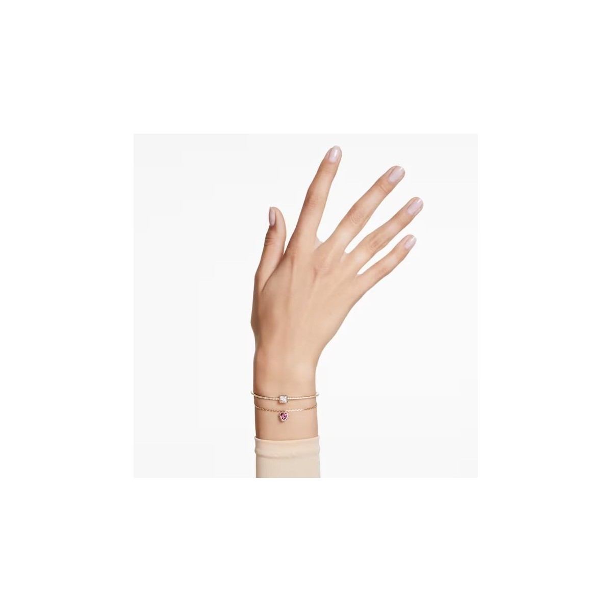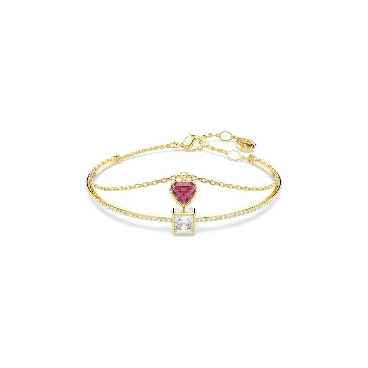 Succombez au charme et à l'esprit romantique de cet étonnant bracelet double. Son design avec placage de ton or comprend un anneau rigide orné d'un pavé incolore et d'une pierre centrale carrée en Swarovski Zirconia incolore, tandis que la chaîne est ornée d'une pierre centrale en forme de cœur créée avec des Swarovski Zirconia rouges et rehaussée de cristaux carrés incolores sur les bords. Ponctué d'un fermoir mousqueton.