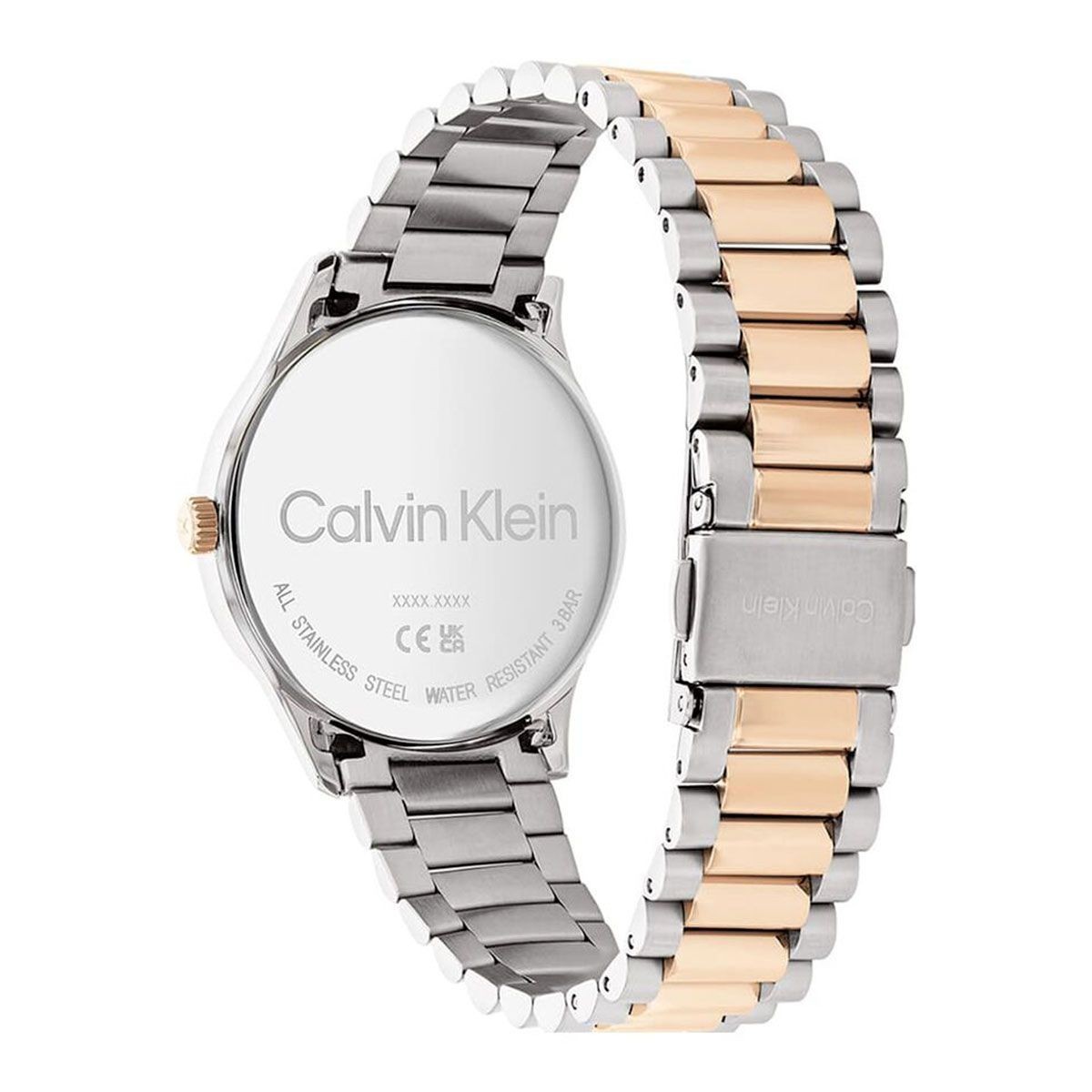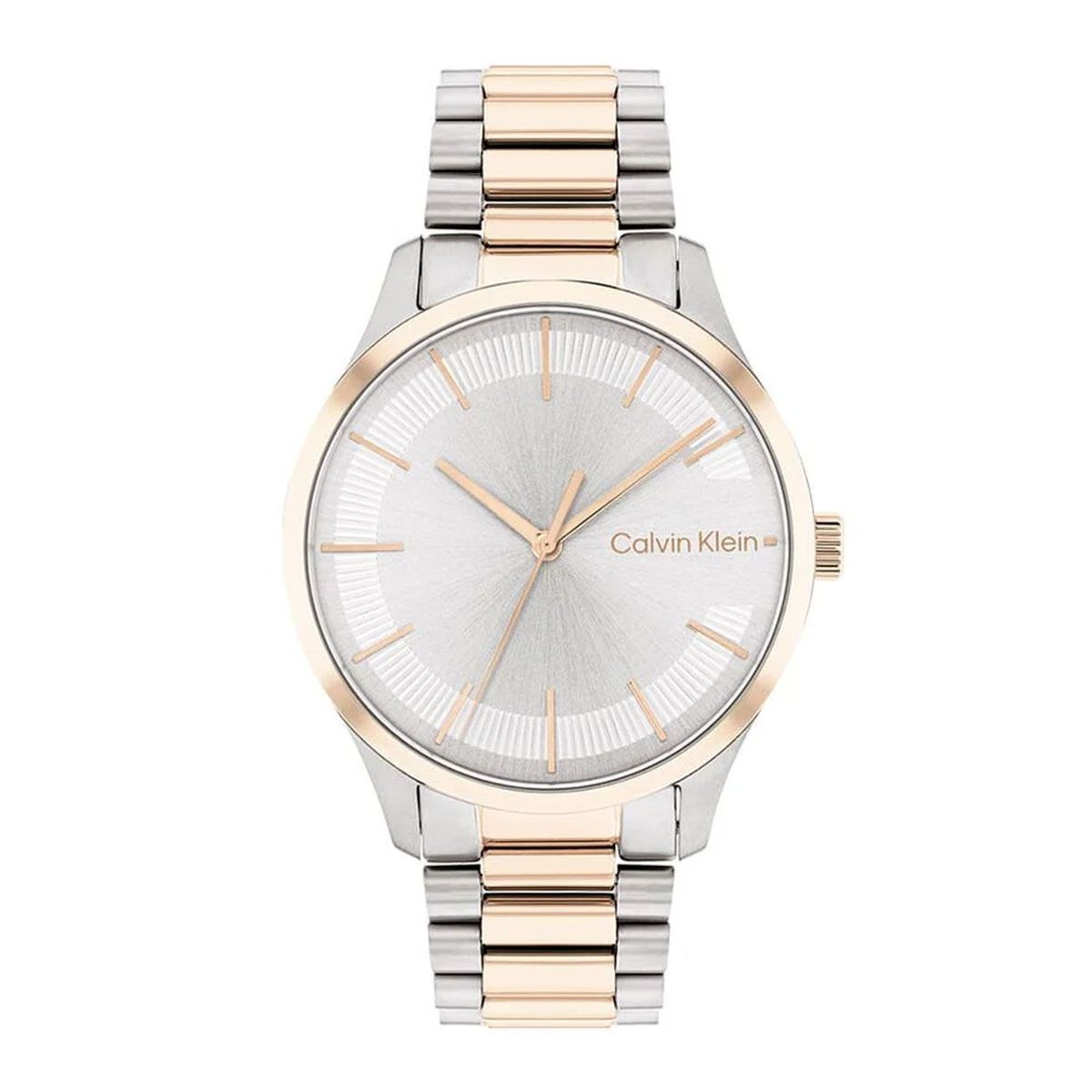 La montre Iconic Bracelet en acier bicolore doré rose possède un boitier de 35 mm de diamètre, un cadran argenté soleillé et un bracelet en acier bicolore doré rose avec boucle déployante