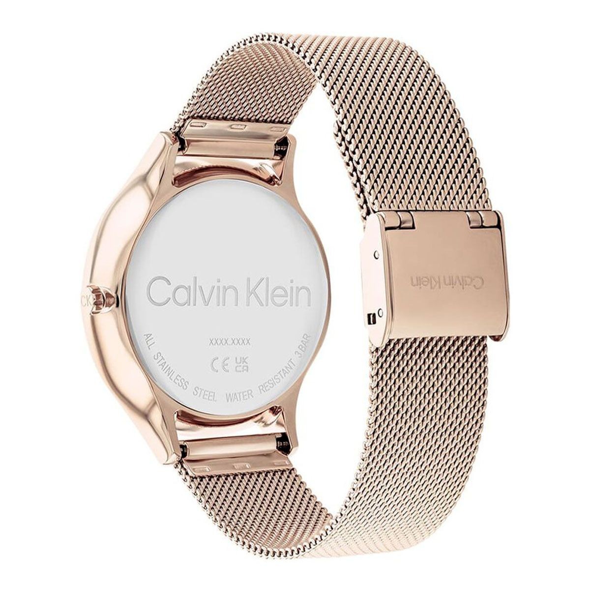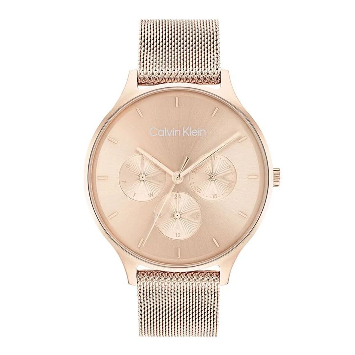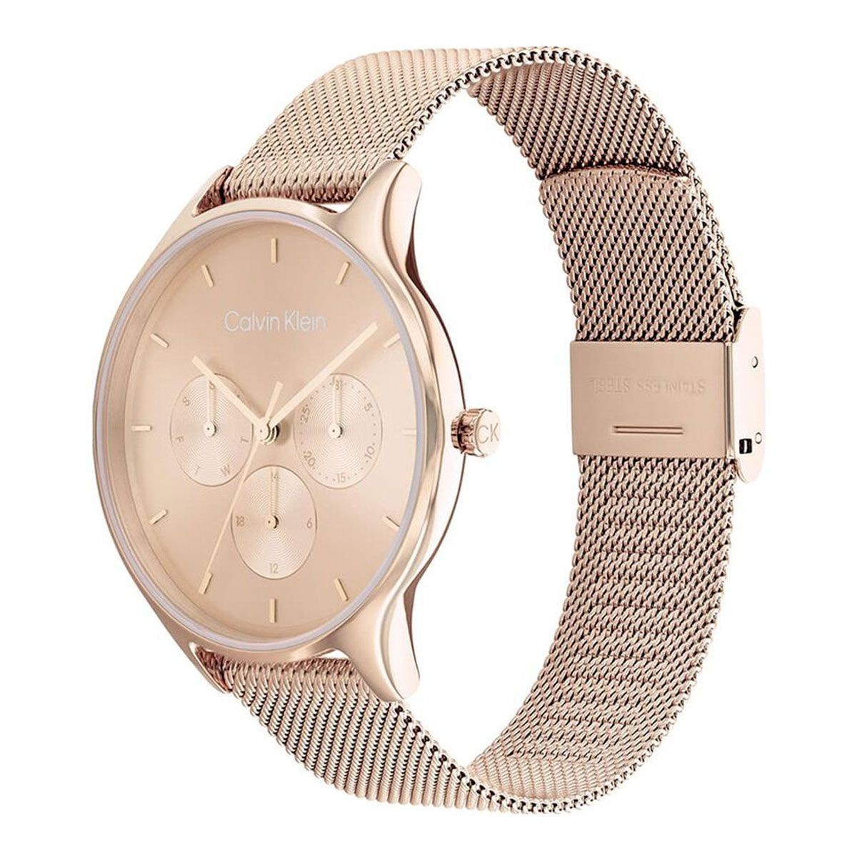 La montre Timeless Multi possède un boîtier rond en acier PVD rose gold d'une dimension de 38mm de diamètre, cadran doré rose à la finition soleillé avec un compteur date à 3h, un compteur 24h à 6h et un compteur jour, vous indiquant les jours de la semaine en anglais à 9h. Son bracelet en mailles milanaises est en acier PVD rose