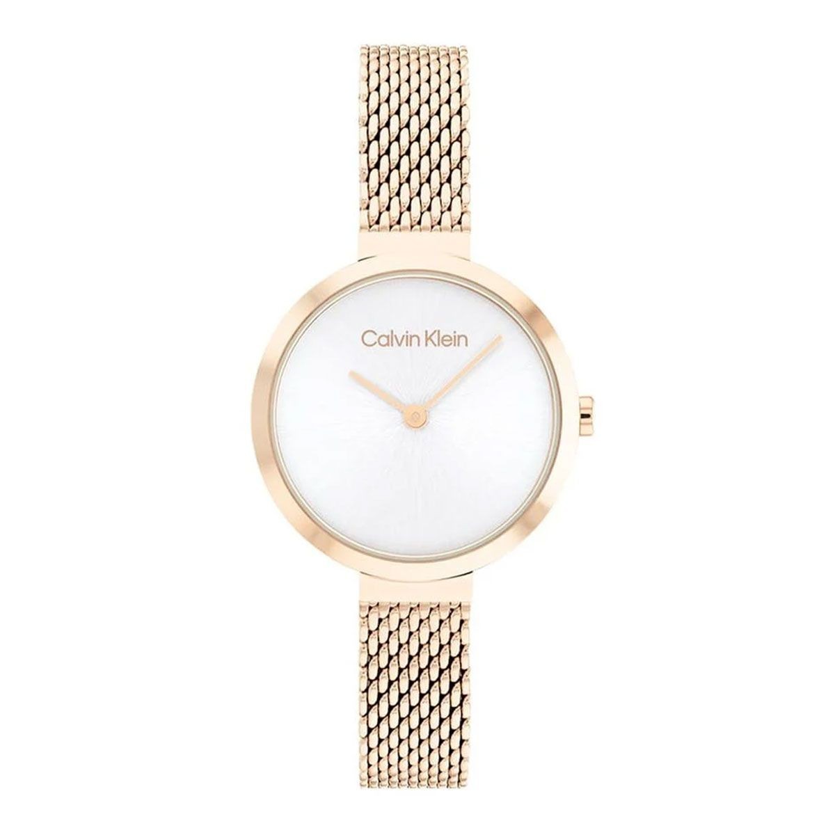 La montre Timeless Minimalistic T Bar en acier doré rose possède un boitier de 28 mm de diamèter avec un cadran blanc et un bracelet en maille millanaise