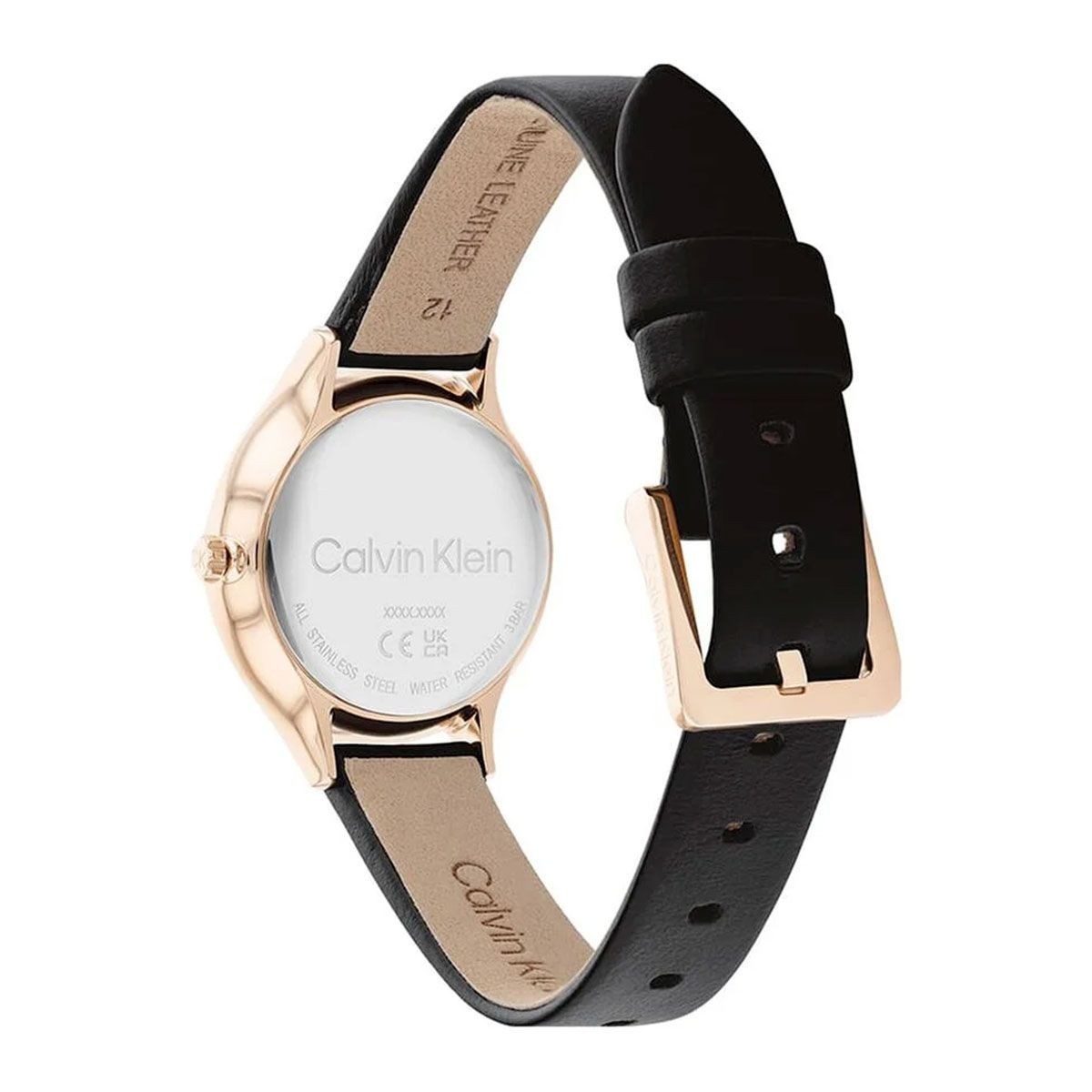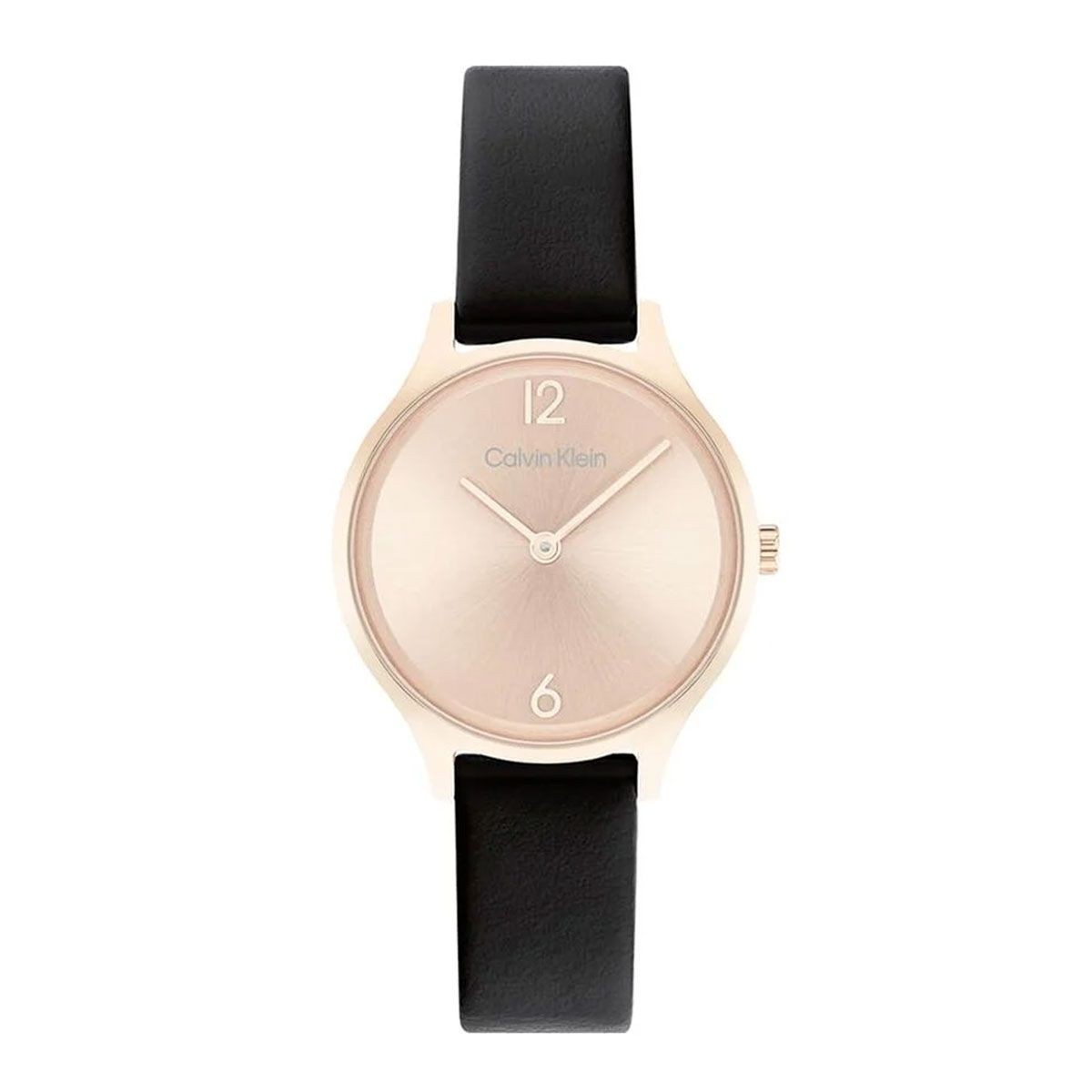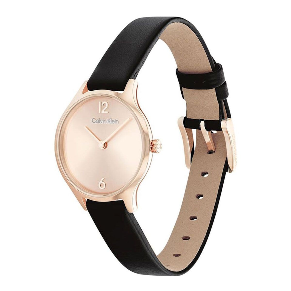 La montre Timeless 2H possède un boitier en acier doré rose de 28 mm de diamètre avec un cadran soleillé et un bracelet en cuir noir