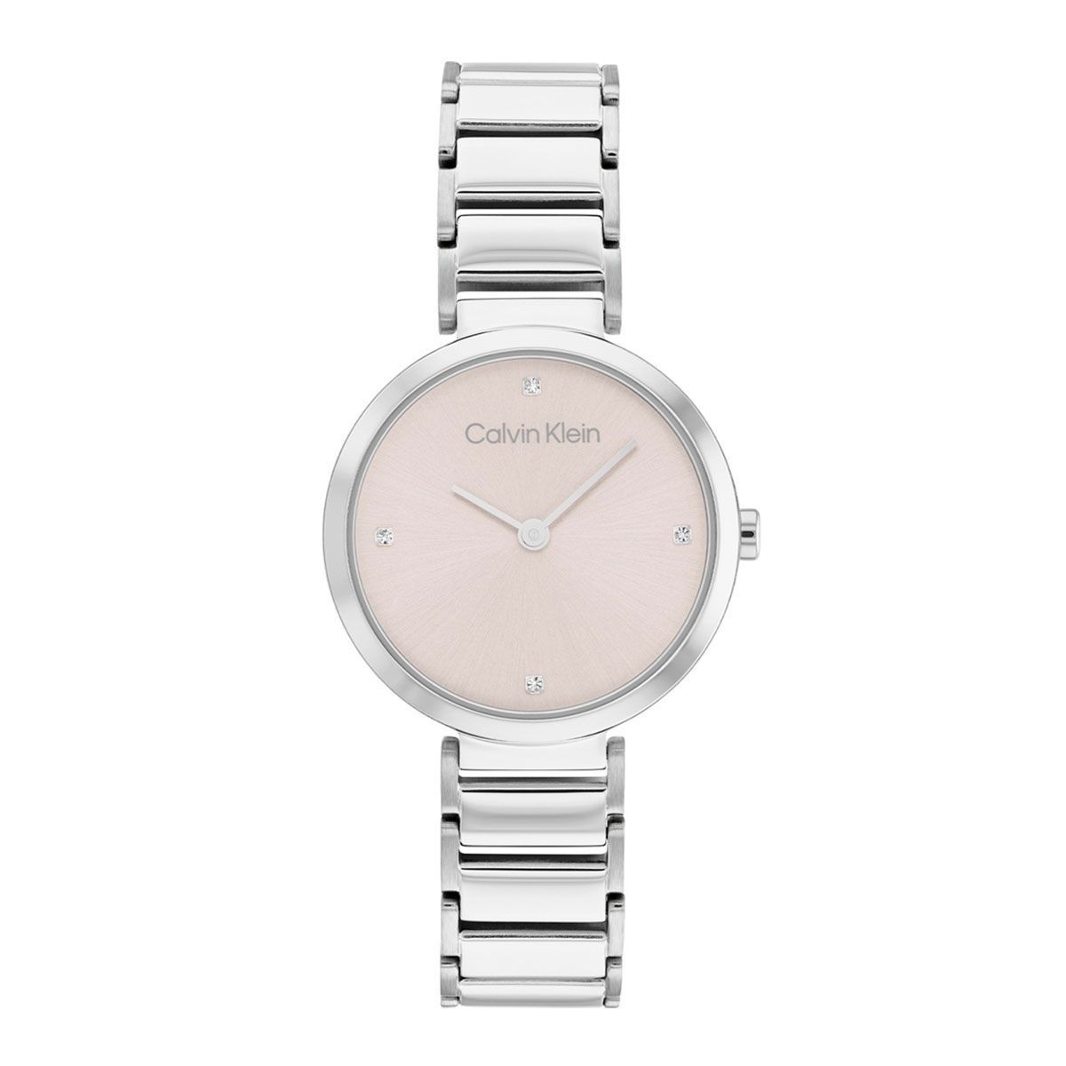 Cette montre de la collection Minimalistic T Bar en acier inoxydable possède un mouvement quartz 2 aiguilles et un cadran rose avec index strass