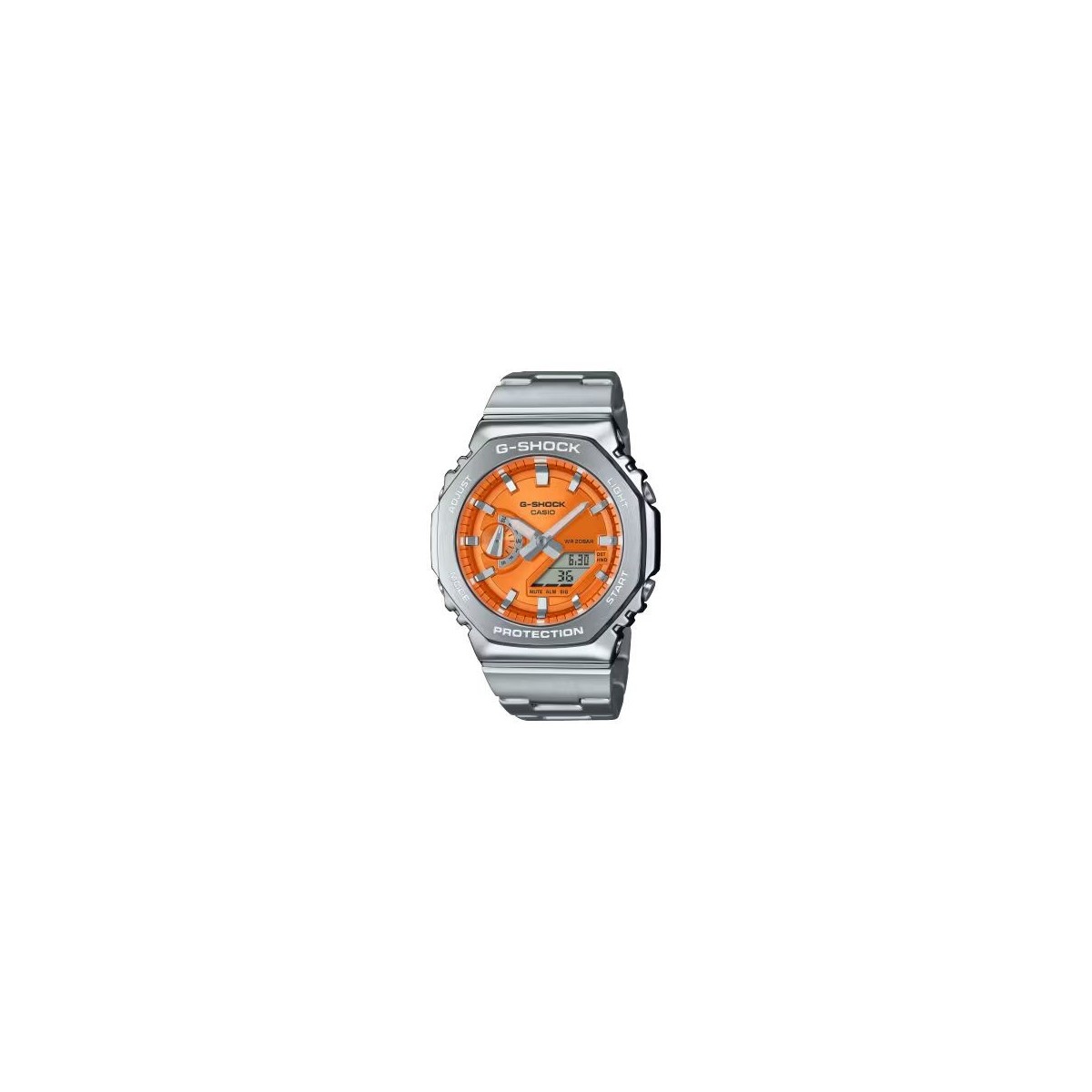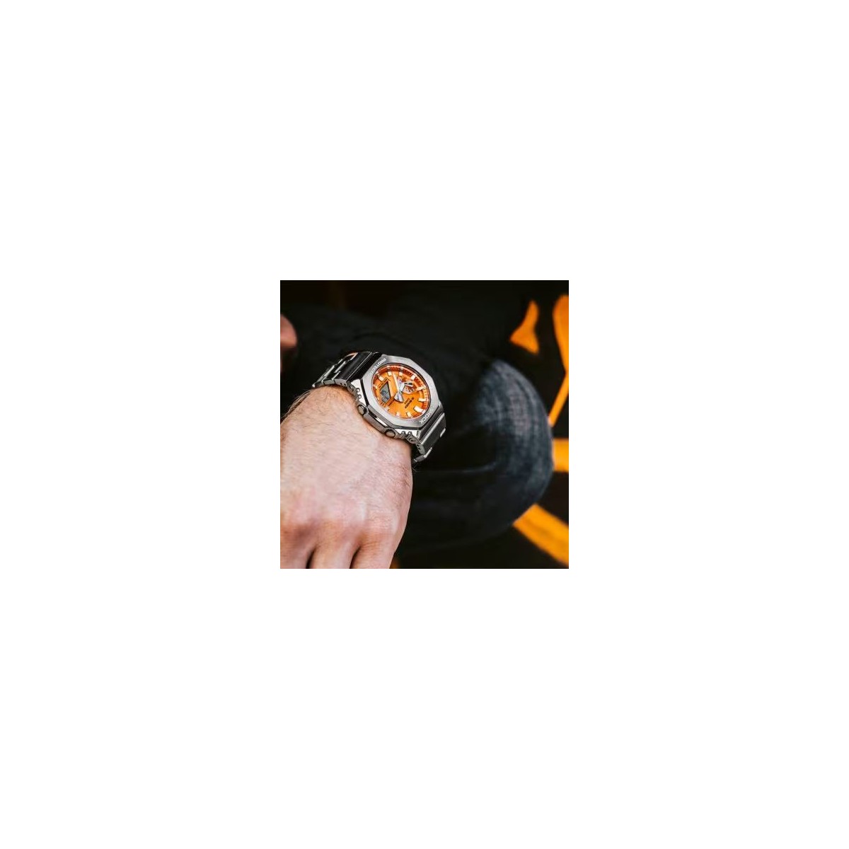 Découvre la toute nouvelle GM-2110D, une montre G-SHOCK combinant l'affichage analogique et numérique qui s'inspire de la GA-2100, mais avec une lunette et un bracelet en métal.