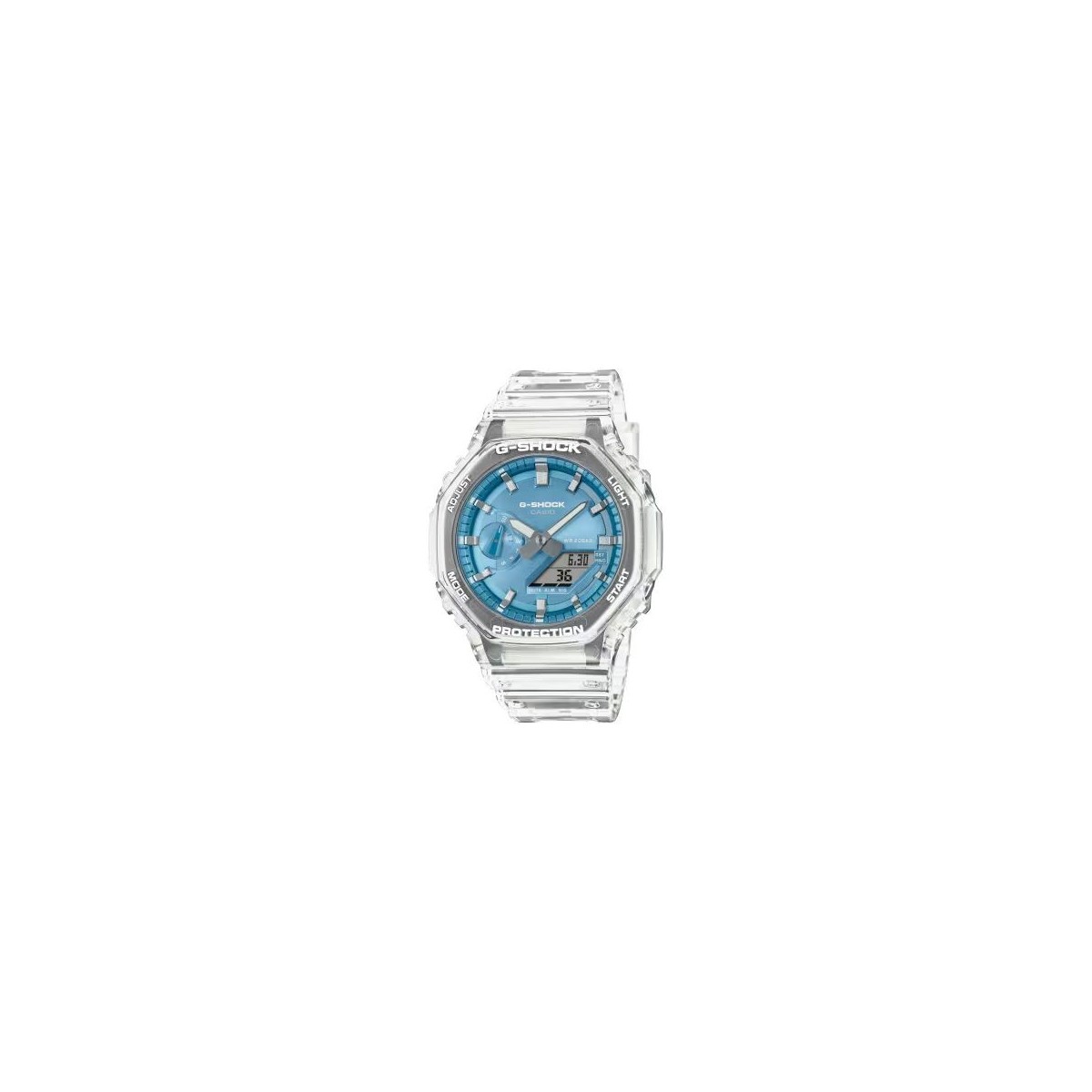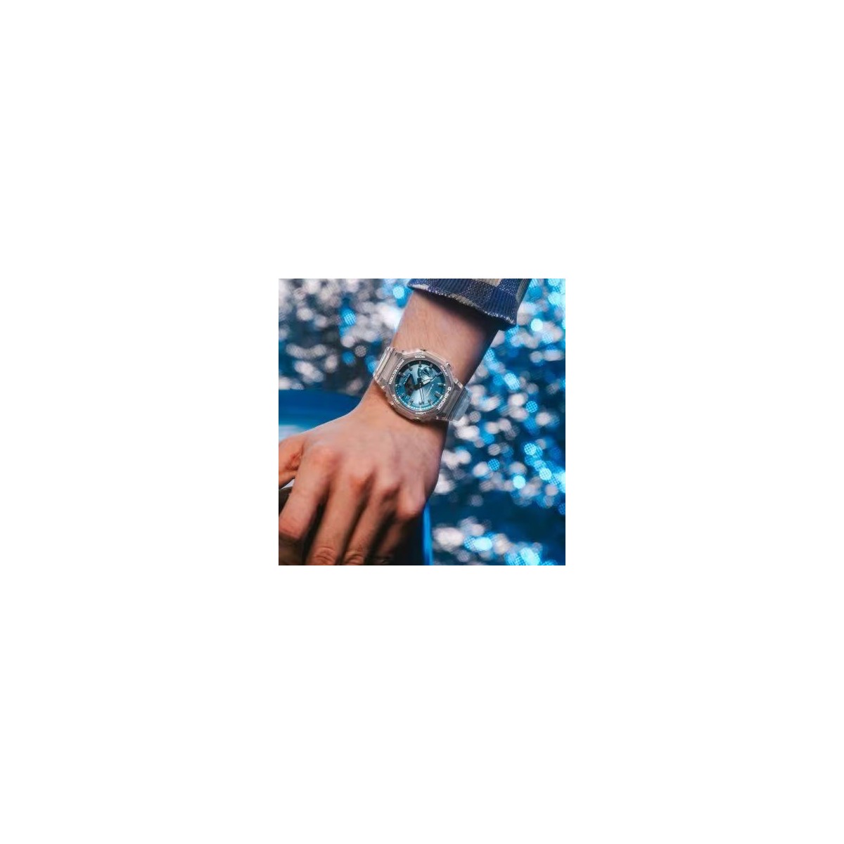 La lunette octogonale emblématique de la GA-2100 est modernisée grâce à un cadran métallique bleu réalisé par dépôt de vapeur, et un bracelet translucide.
