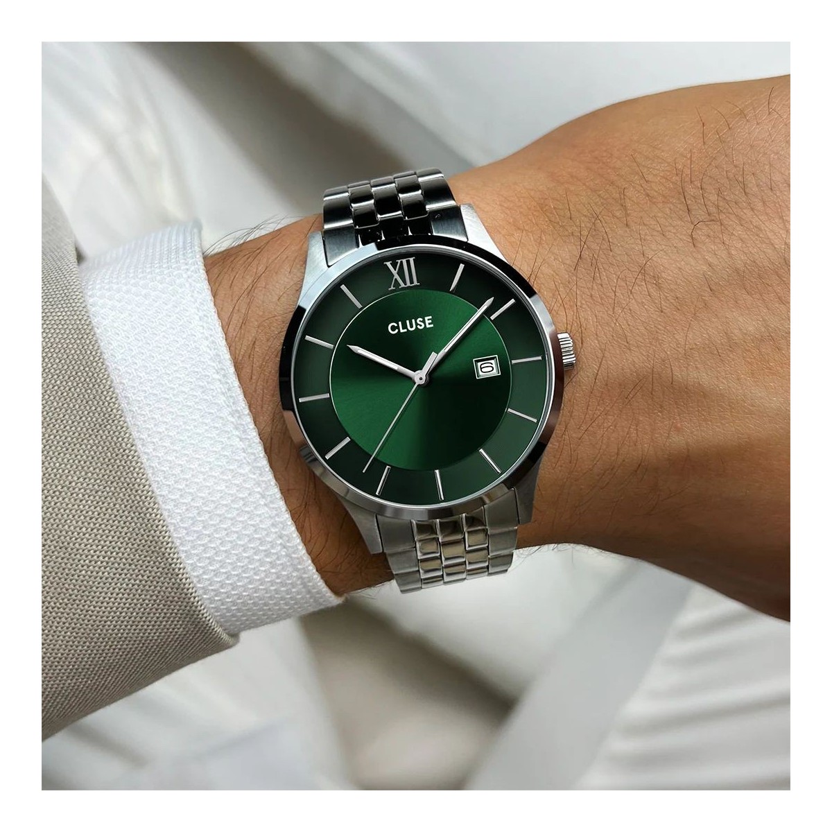 L'acier inoxydable et le minimalisme épuré sont au cœur de notre collection Aravis pour hommes. Cette montre à 3 aiguilles, au cadran rond, est dotée d'une fonction date, située sur le côté droit du cadran de la montre, et d'une combinaison contrastante des couleurs argent et vert, créant une esthétique à la fois classique et dynamique. Résistance à l'eau : 5 ATM.