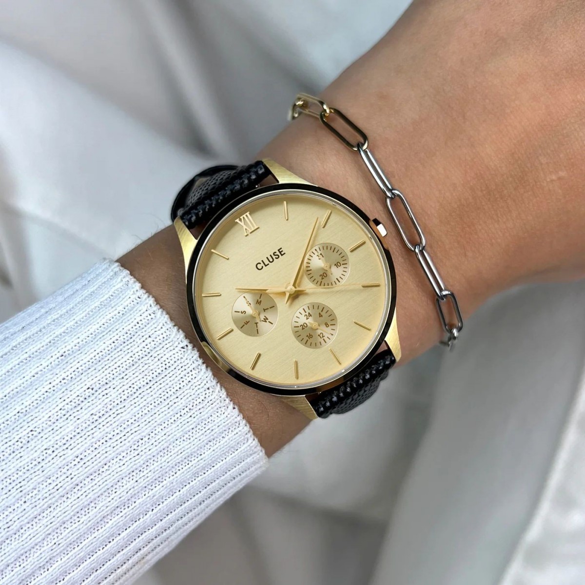 Elle est dotée d'un boîtier rond de 34 mm, de couleur or, d'un bracelet en cuir noir et de 3 sous-cadrans pour suivre le jour et l'heure. Cette montre classique associant les couleurs or et noir sera à coup sûr l'accessoire de mesure du temps luxueux et silencieux par excellence ! Personnalisez facilement le look de votre montre avec n'importe quel bracelet de montre de 16 mm. Vous pouvez facilement ajuster vous-même la taille du bracelet de montre.