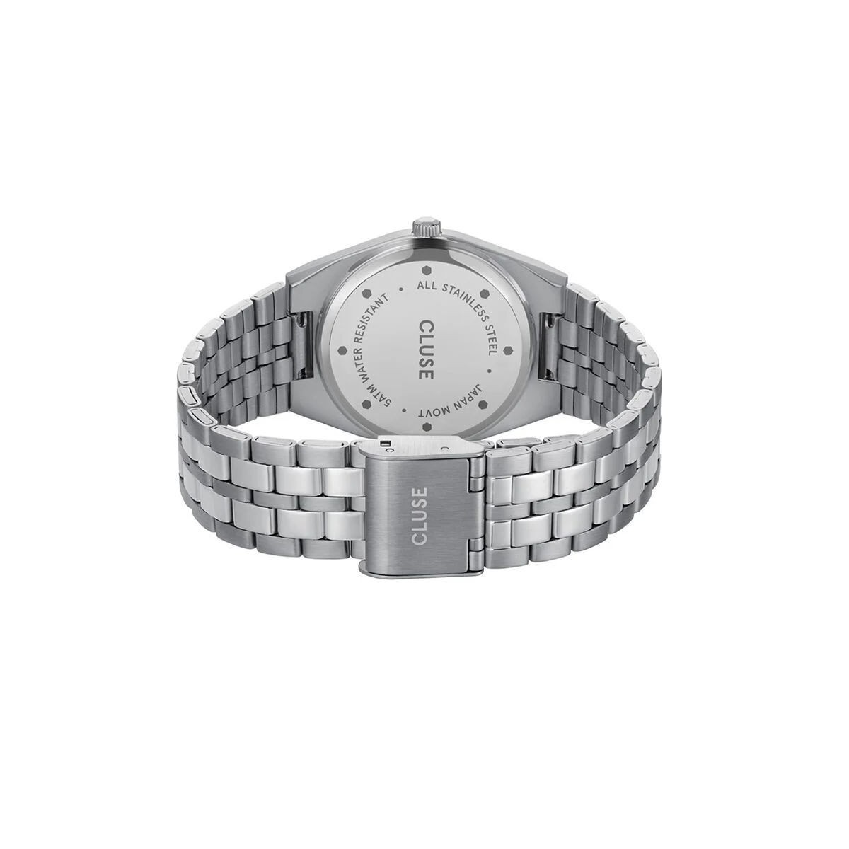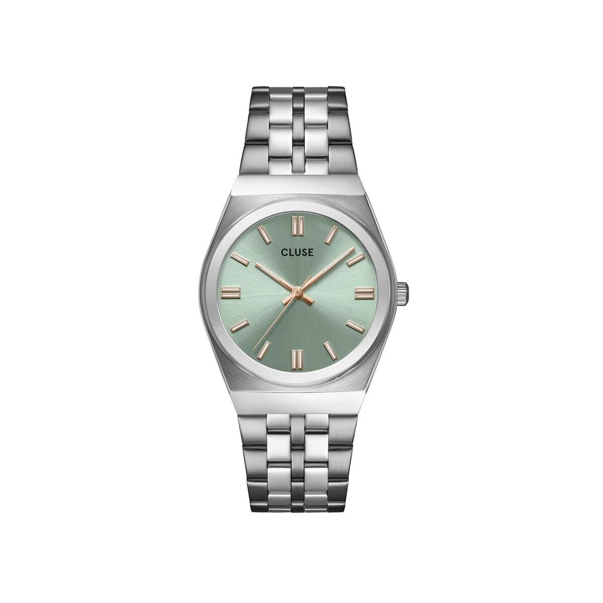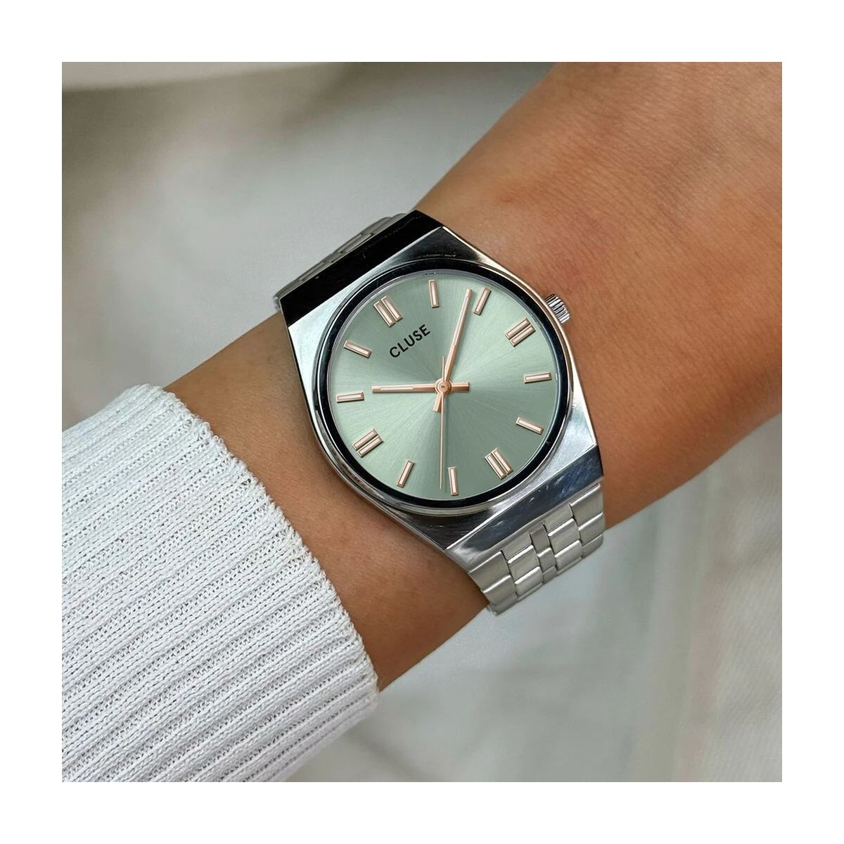 La montre ronde rétro des années 70 pour femme est dotée d'un boîtier argenté de 33 mm, d'un cadran vert sauge d'aspect vintage avec des aiguilles en or rose et d'un bracelet en acier inoxydable argenté à 5 maillons de 20 mm.