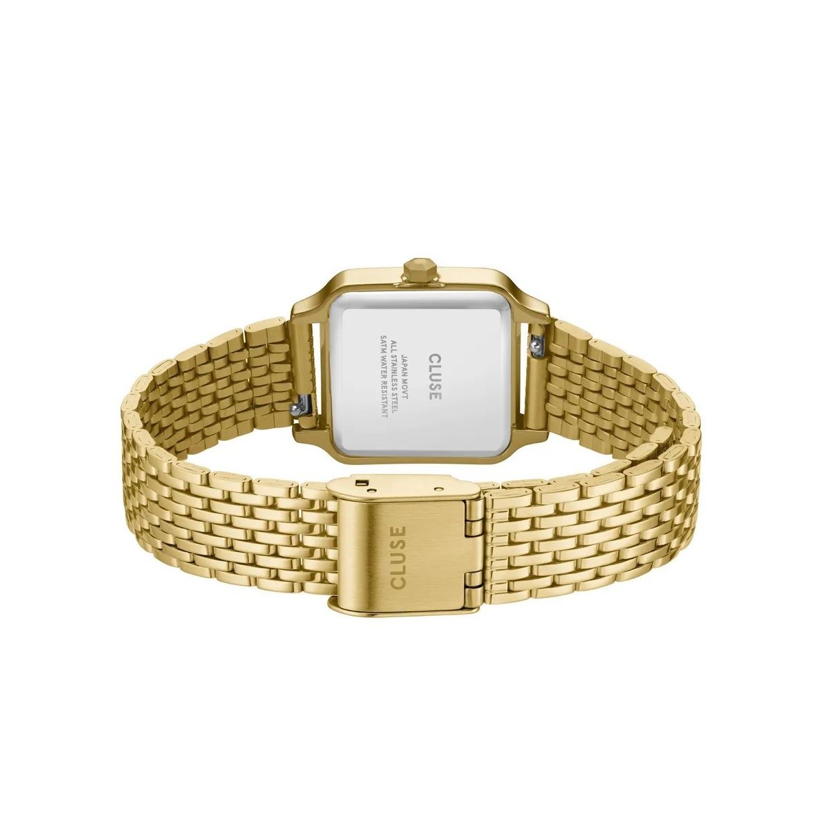La montre carrée Gracieuse Petite pour femmes est dotée d'un boîtier doré de 24 mm, d'un cadran blanc et d'un bracelet en acier inoxydable doré à 9 maillons de 14 mm.