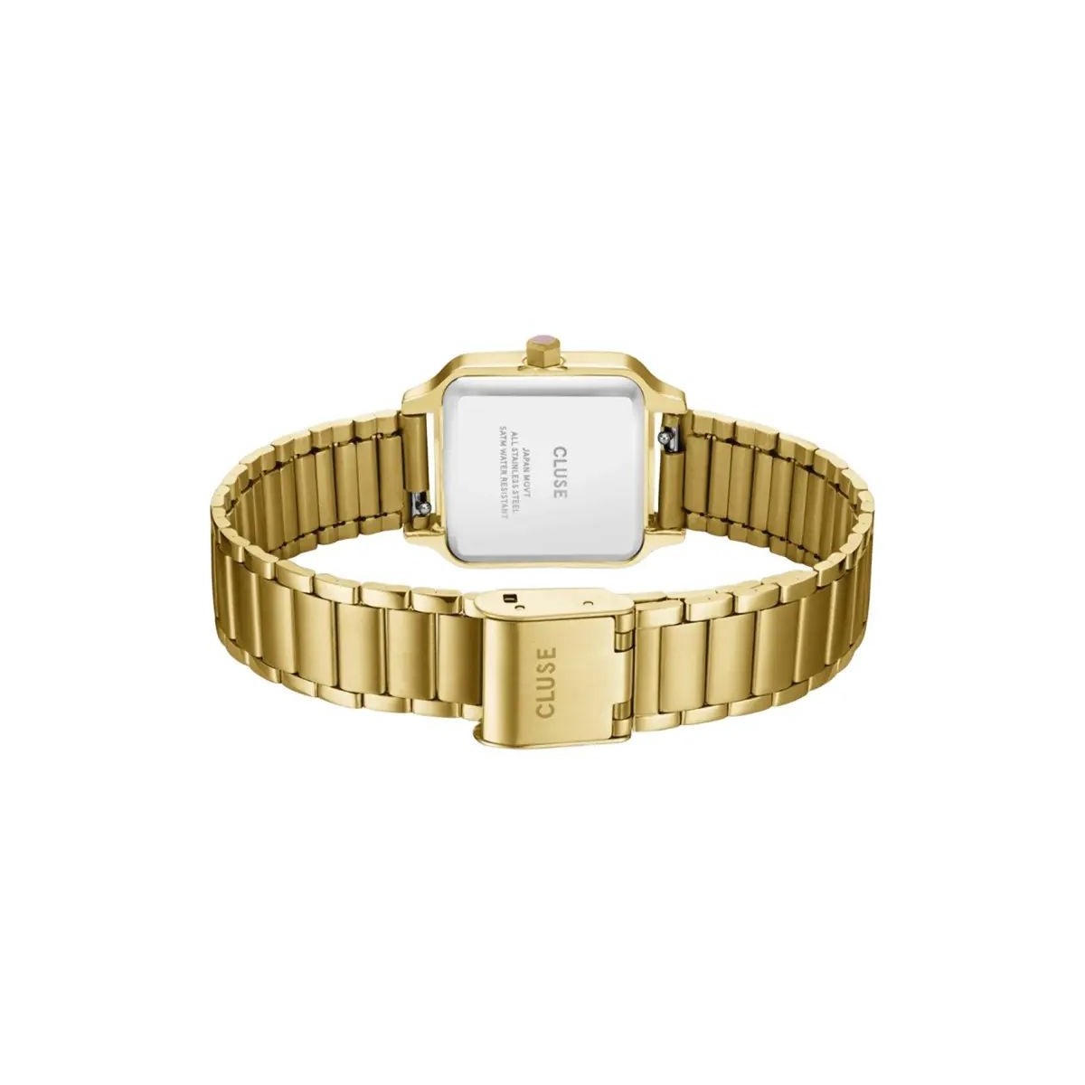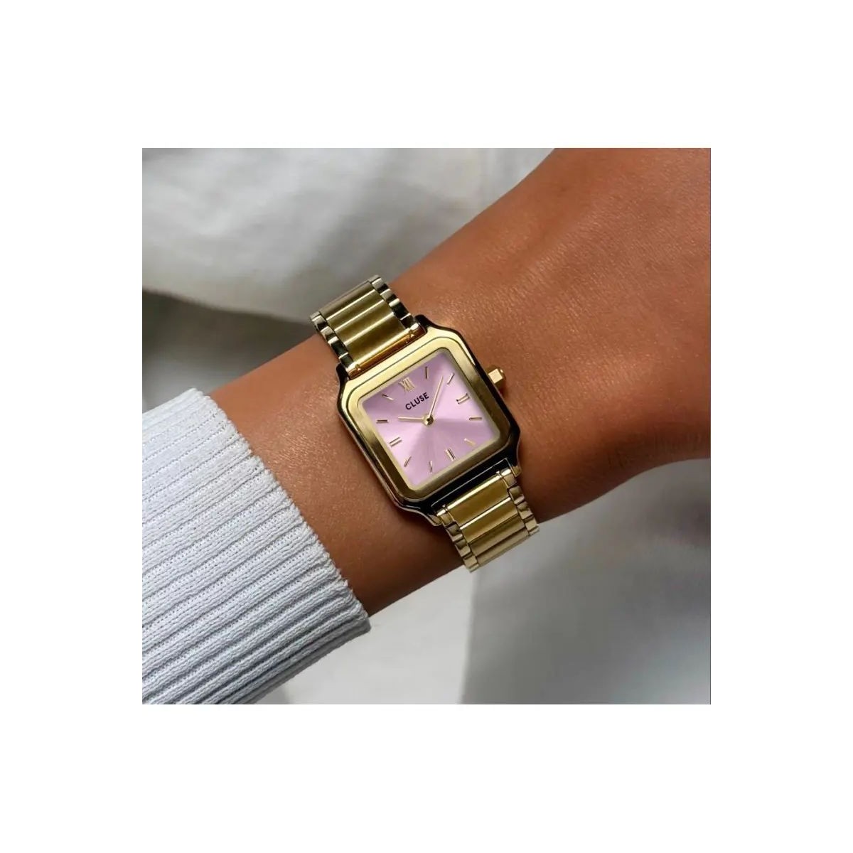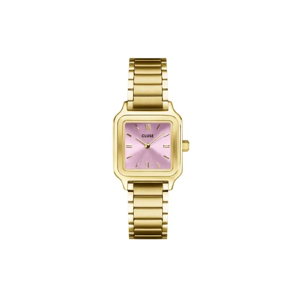 Ajoutez une touche de couleur à votre look avec la montre pour femme Gracieuse Petite rose mauve et or. Elle est dotée d'un boîtier carré doré, d'un bracelet à trois maillons de 14 mm dont vous pouvez facilement ajuster vous-même la taille, et d'un cadran rose mauve avec couronne assortie.