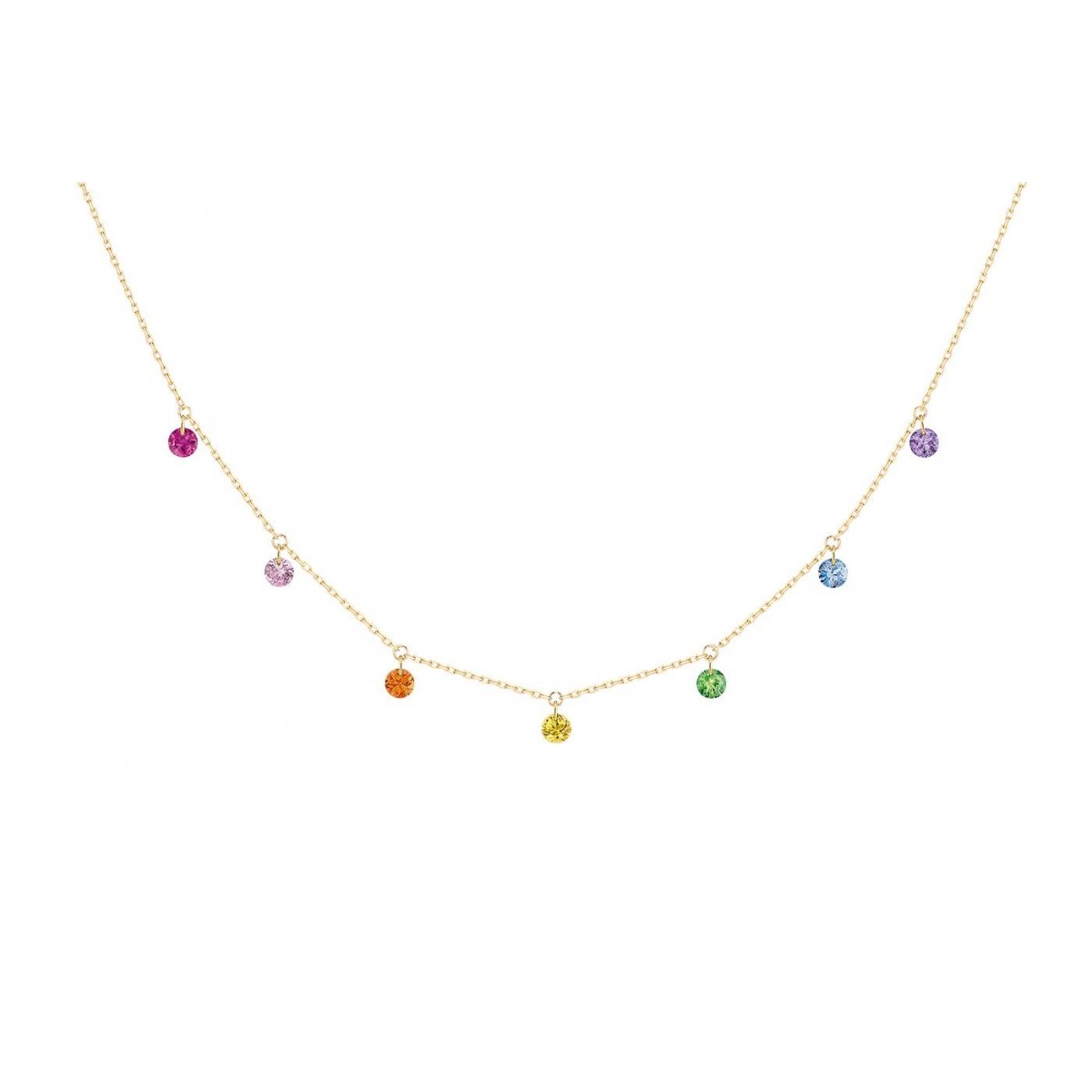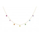 Le collier RAINBOW de la collection CONFETTI présente 7 pierres naturelles : un rubis, un saphir rose, un saphir orange, un saphir jaune, un saphir bleu, une tsavorite et une améthyste.