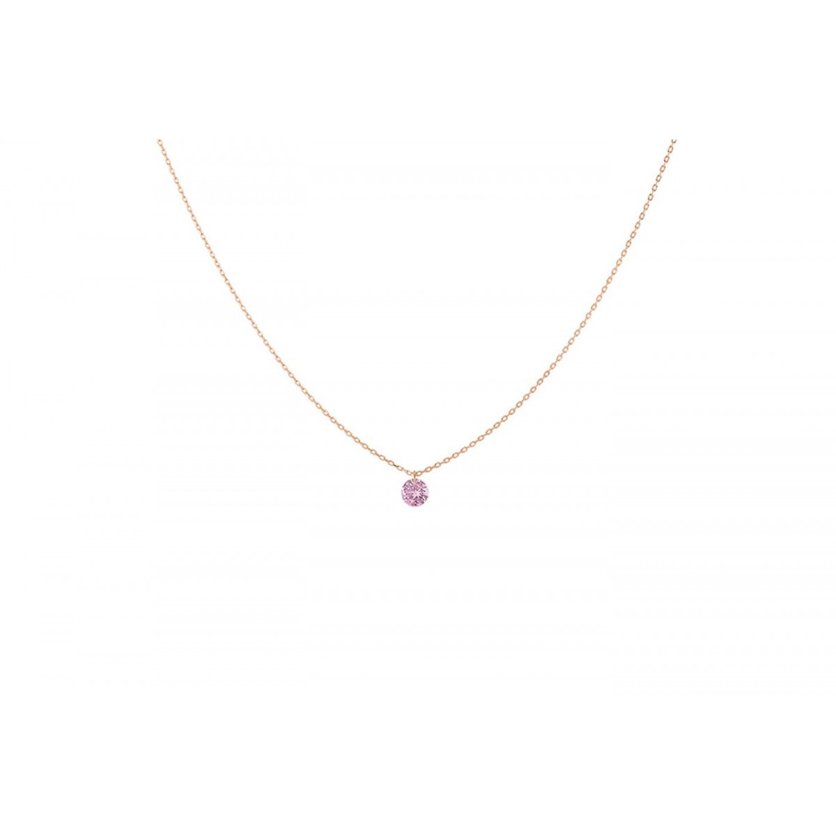 Son saphir rose naturel est monté sans serti (pierre percée), sur une chaîne facettée en or rose 18kt.