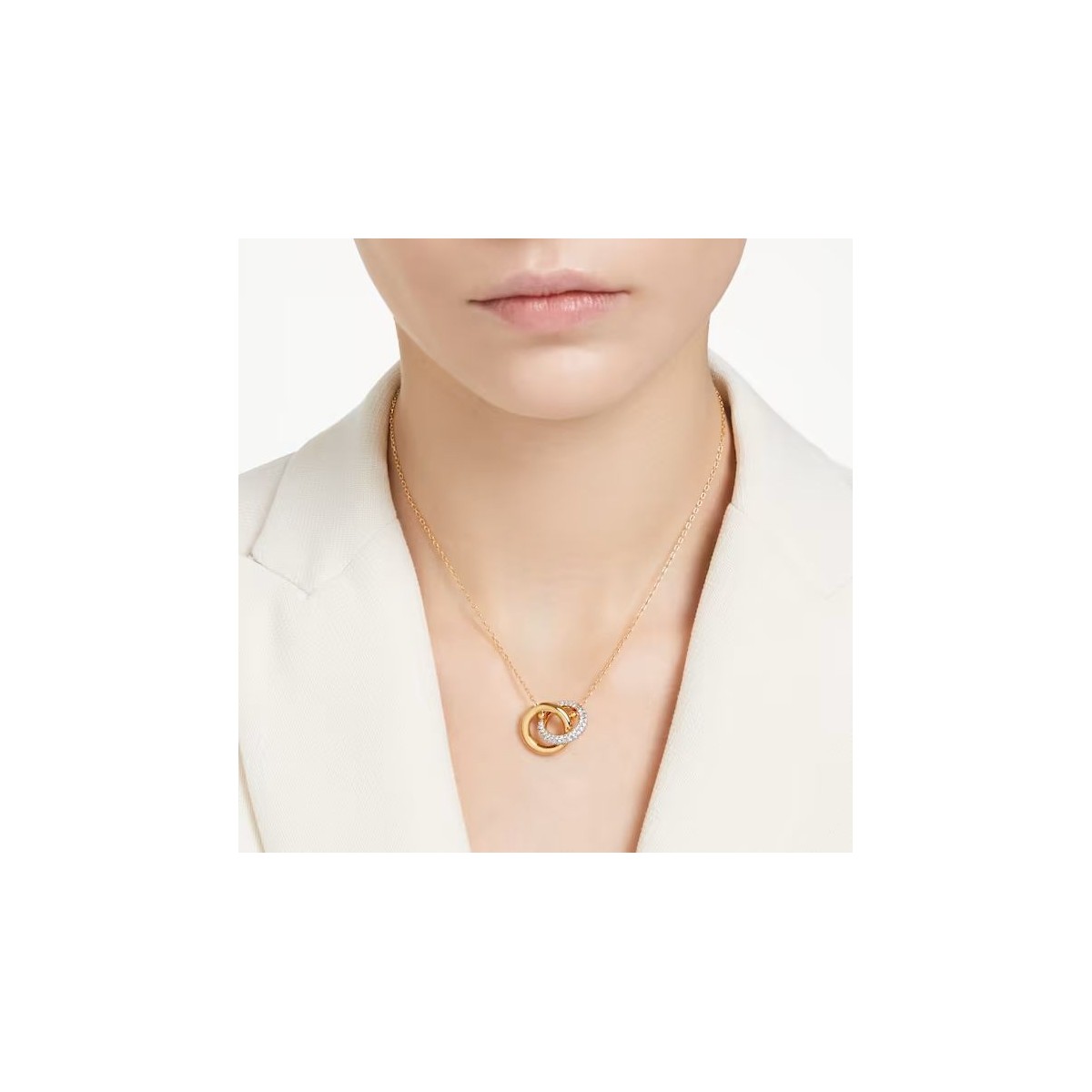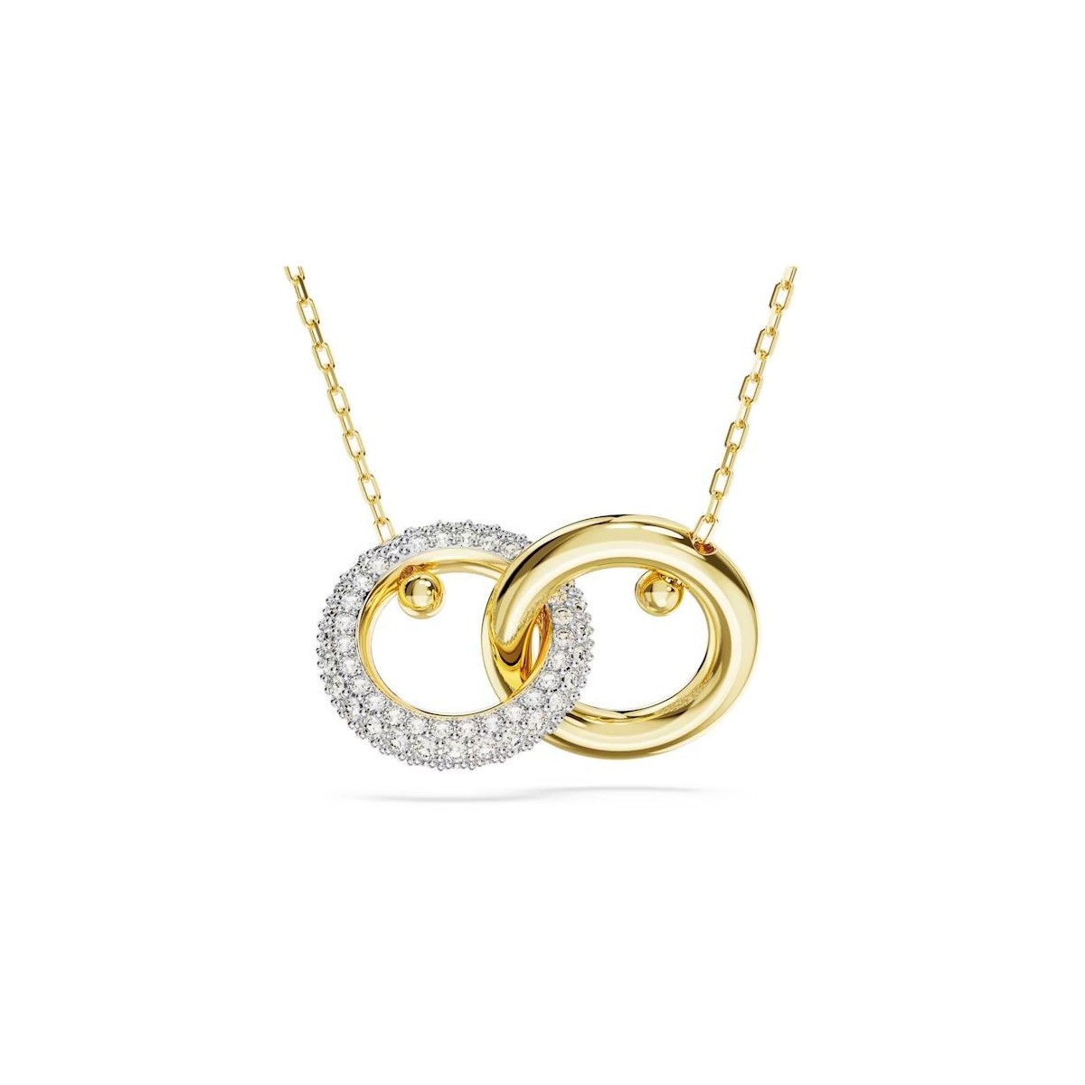 Faites le choix de l'harmonie et adoptez dès maintenant ce pendentif étincelant de la famille Dextera. Ce design en placage de ton or présente deux anneaux tubulaires entrelacés, dont un intégralement pavé. Sa chaîne délicate est ornée d'un Zirconia Swarovski à son extrémité, pour la touche de luxe en plus. Associant formes audacieuses et cristaux incolores rayonnants, cette pièce envoûtante habillera votre style de lumière.