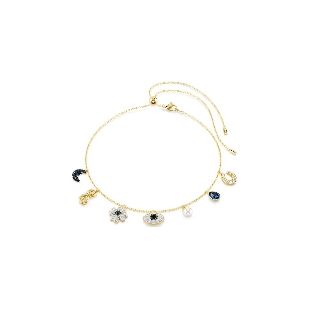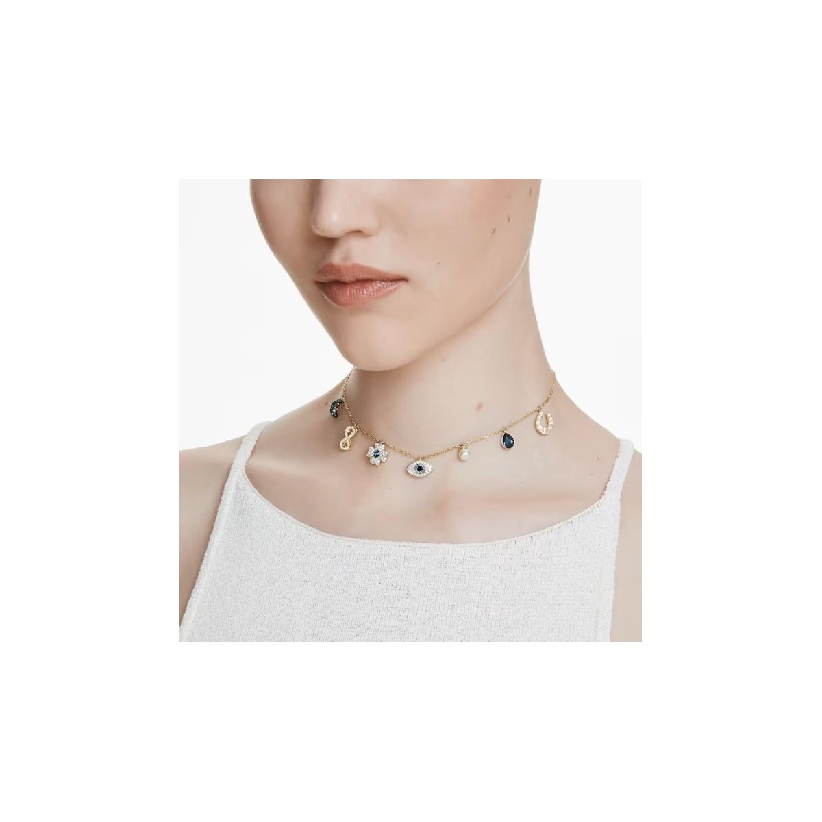 Le style rencontre le mysticisme avec ce choker Symbolica symbolique. Ce bijou présente une chaîne délicate habillée de sept symboles : un trèfle à quatre feuilles, un croissant de lune bleu foncé, un symbole de l'infini, une goutte en forme de poire bleue, une Crystal Pearl de Swarovski orné d'un pavé, un fer à cheval porte-bonheur et un mauvais œil bombé au centre. Chaque élément est orné de merveilleux cristaux.