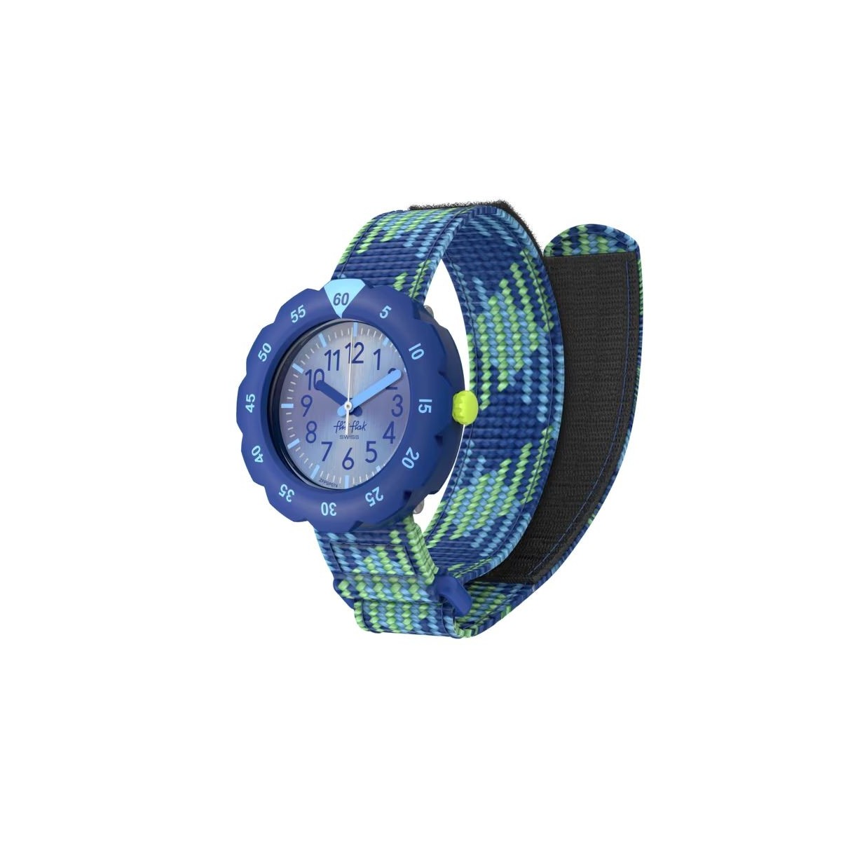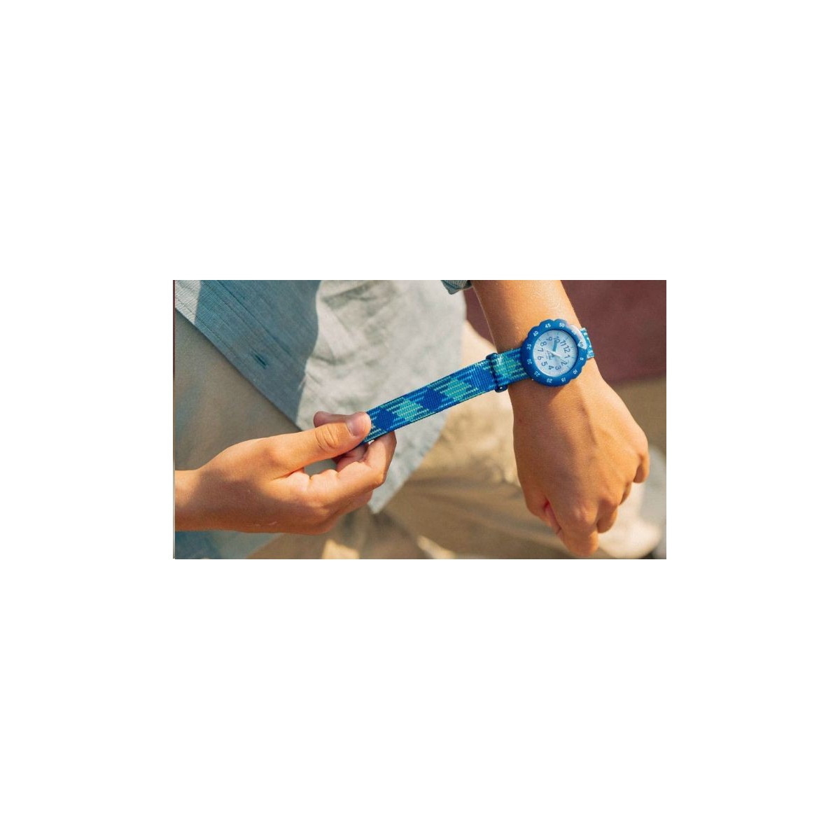 La montre pédagogique pour enfants LOOP IN BLUE est dotée d'une fermeture VELCRO® innovante sur son bracelet motif croisillons aux teintes de bleu et turquoise inspirées de l'océan . Le cadeau parfait pour apprendre aux enfants à lire l'heure.