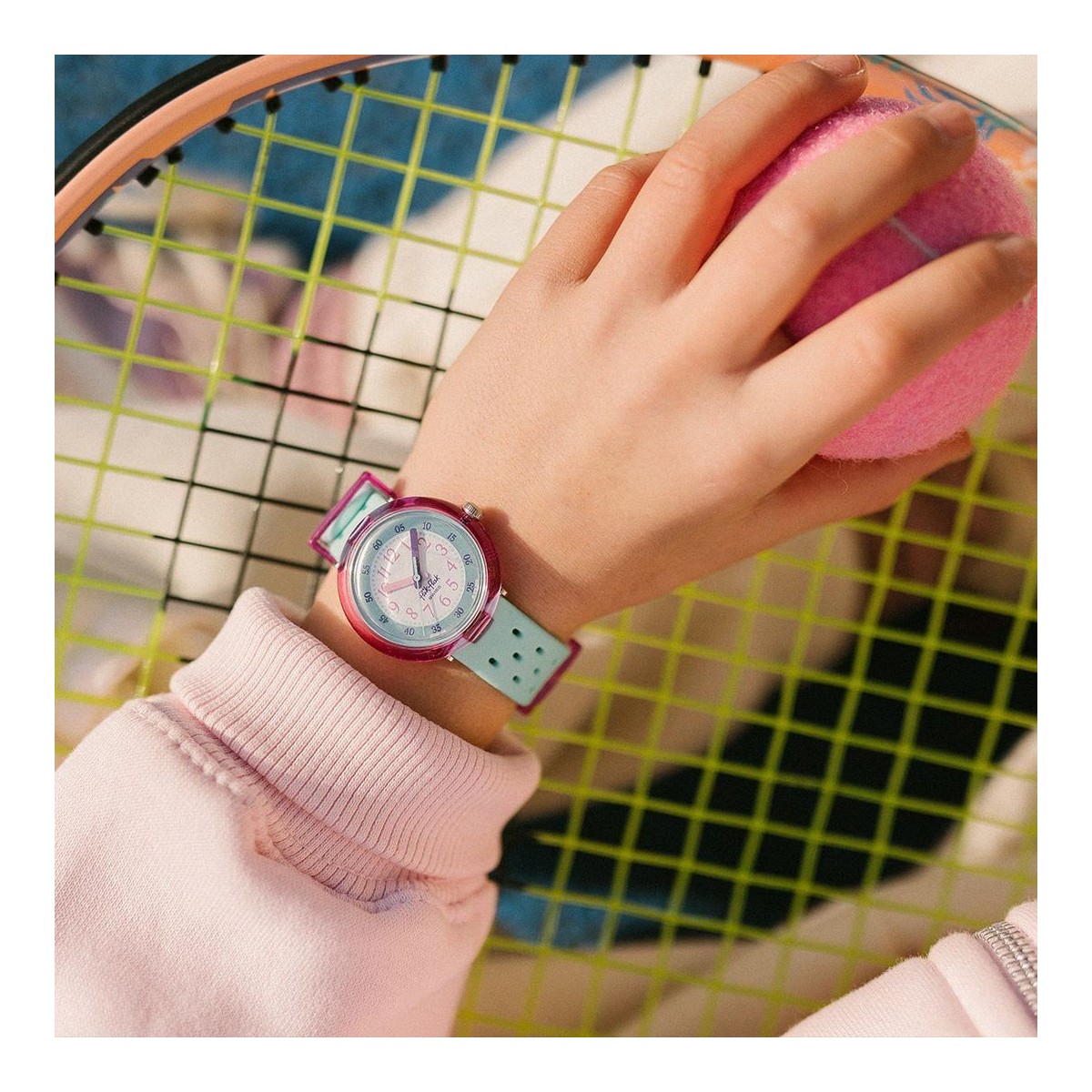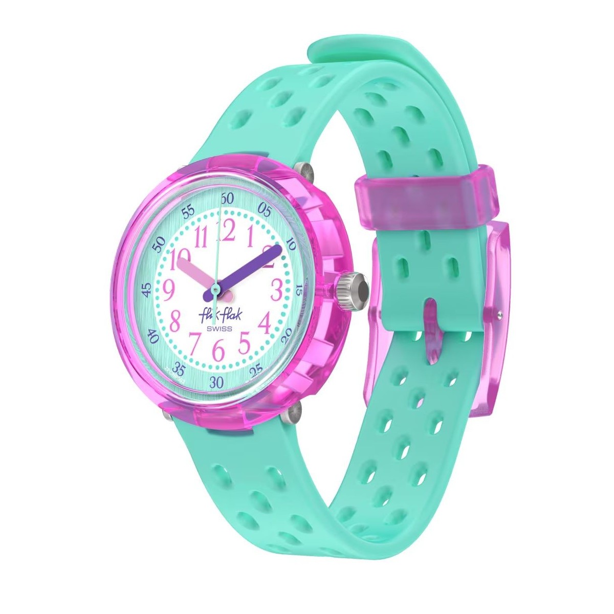 Découvrez la montre pour enfant FIZZ IN MINT, fraîche et amusante avec son bracelet vert menthe et son cadran bleu turquoise ! Le cadeau idéal pour apprendre aux enfants à lire l'heure tout en ajoutant de la couleur à leur style.