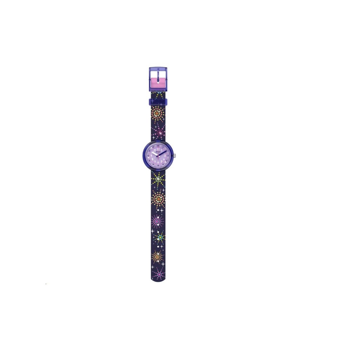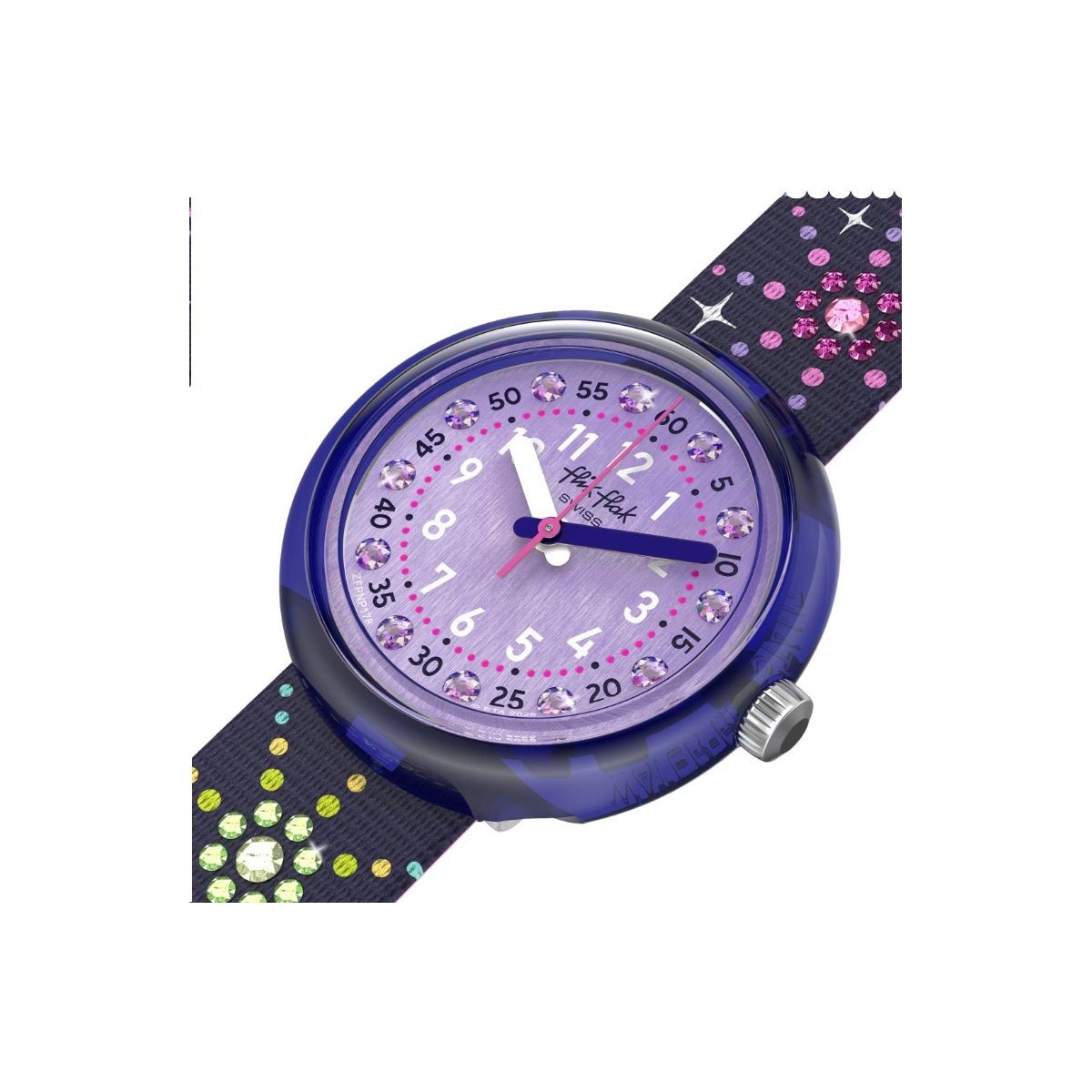 La montre PARTY FINALE est un modèle étincelant pour enfants, avec un bracelet violet profond orné de feux d'artifice et de cristaux. Son boîtier et sa boucle transparents assortis en font un cadeau pédagogique, parfait pour apprendre à lire l'heure avec style et éclat.