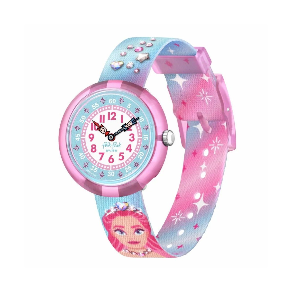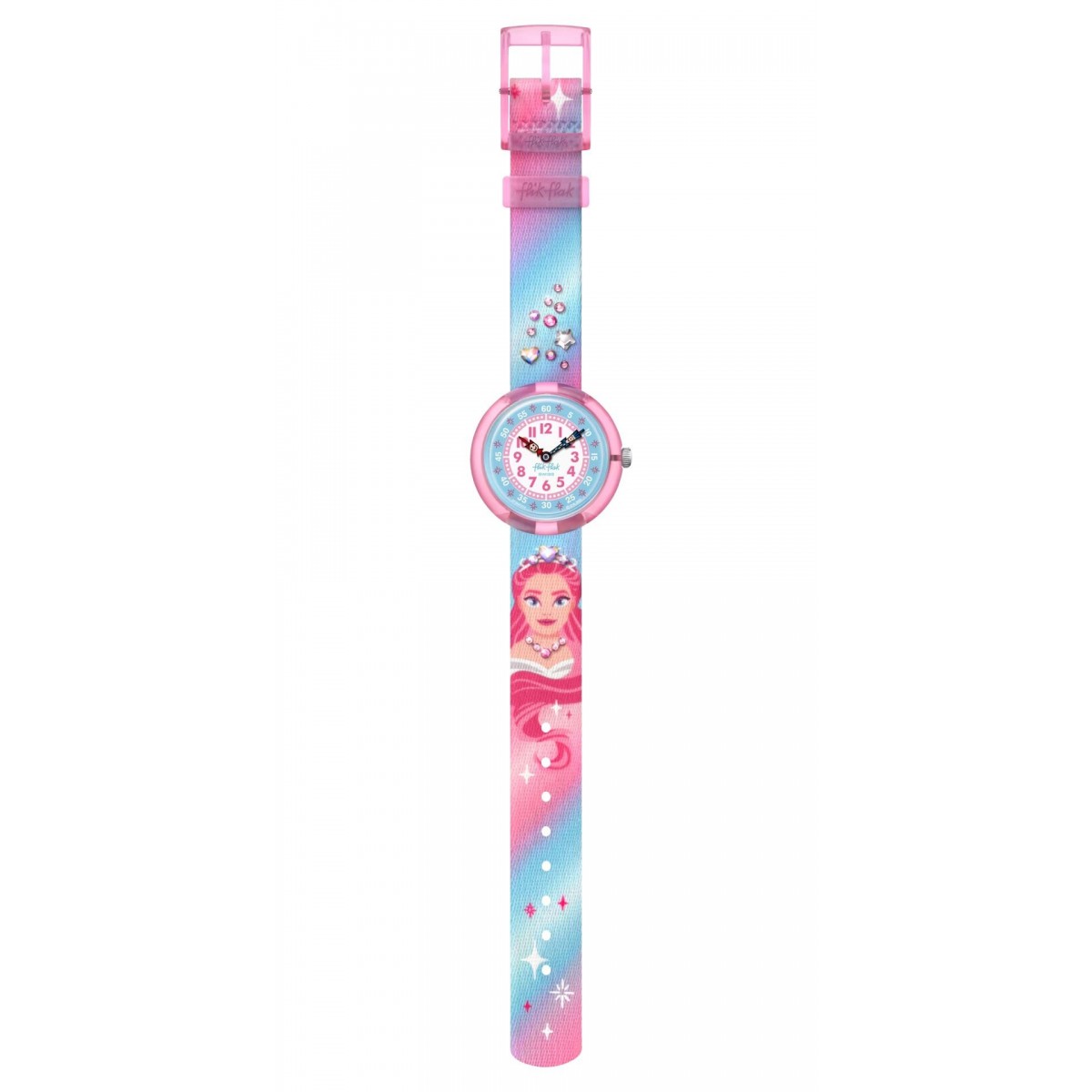 Affichant le joli visage de la princesse accompagné de nombreux cristaux scintillants, la montre pour enfant SPARKLE KINGDOM de Flik Flak est le cadeau idéal pour apprendre à lire l'heure.