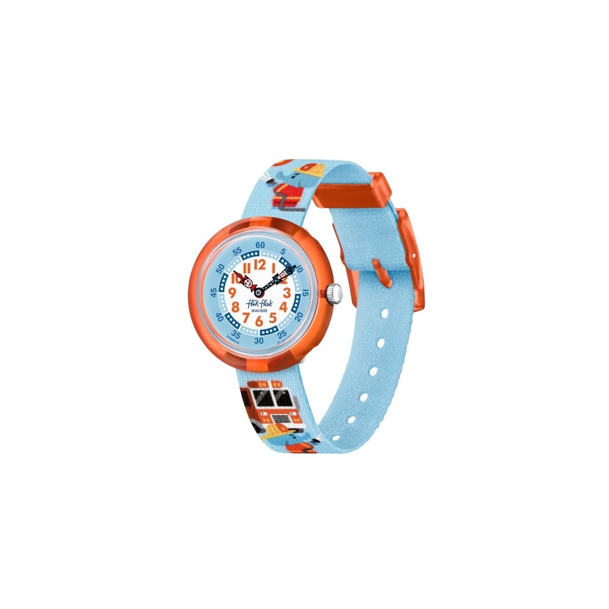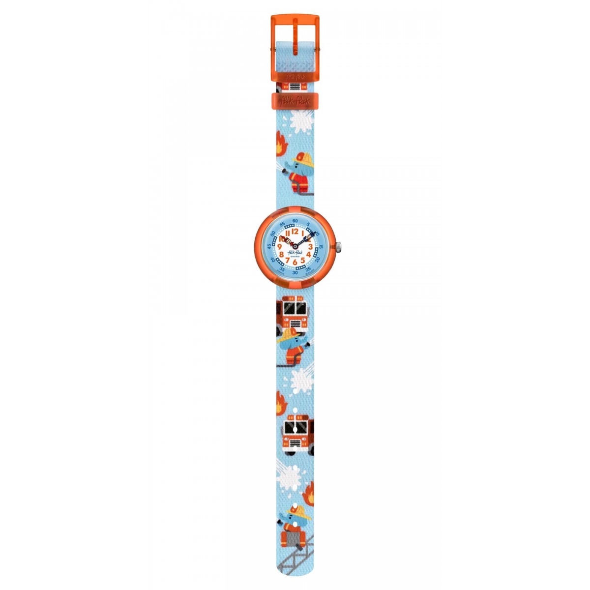 Cap sur l'aventure ! Notre montre bleu clair pour enfants, ornée de camions et d'un éléphant pompier, saura les mettre de bonne humeur.
