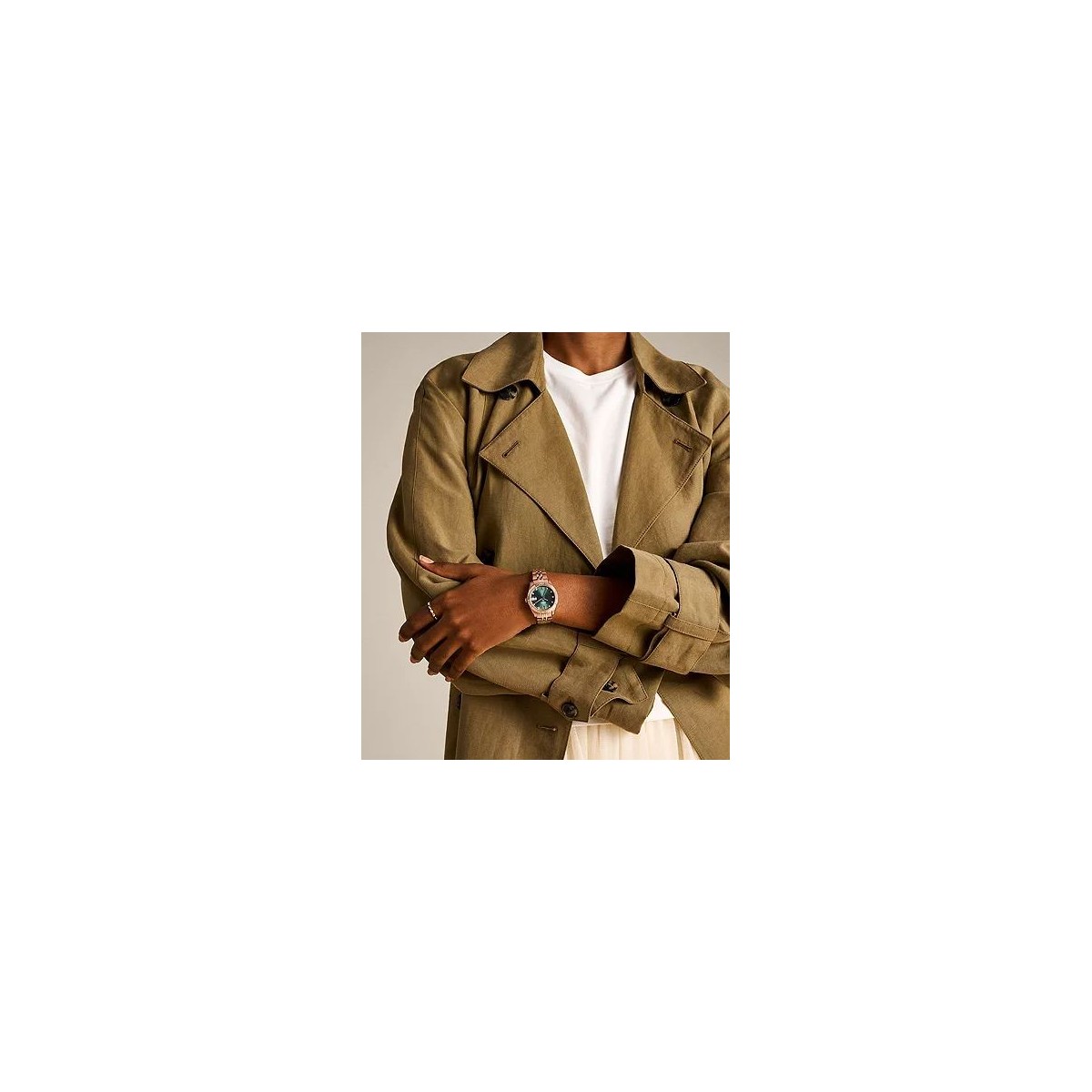 Cette montre Scarlette de 32 mm présente un cadran soleillé vert, un mouvement à trois aiguilles avec date et un bracelet en acier inoxydable doré rose.
