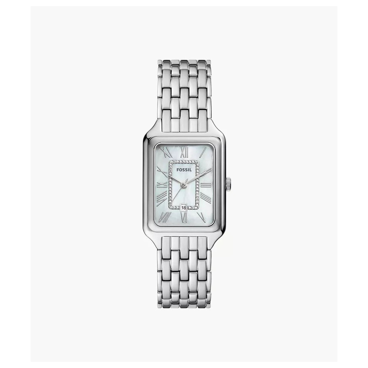 Véritable icône issue de nos archives, la montre rectangulaire Raquel a été remise au goût du jour. Extra-plate et polyvalente, elle présente un cadran de montre en nacre avec un cadre interne étincelant, un mouvement à trois aiguilles avec date et un bracelet à 7 maillons en acier inoxydable poli-brillant brossé.