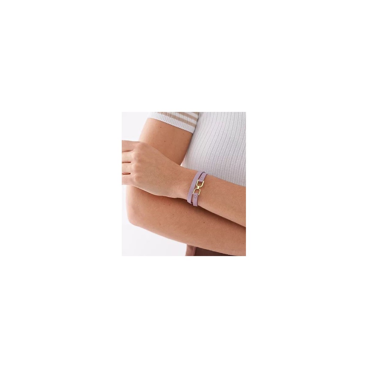 La couleur parfaite pour la saison. Offrant des possibilités presque infinies, pour l'associer à vos modèles actuels et futurs. Ce bracelet présente nos emblématiques finitions métalliques à double maillon en D en acier inoxydable doré, un fin bracelet en cuir violet et des surpiqûres ton sur ton pour un look monochrome et coloré.