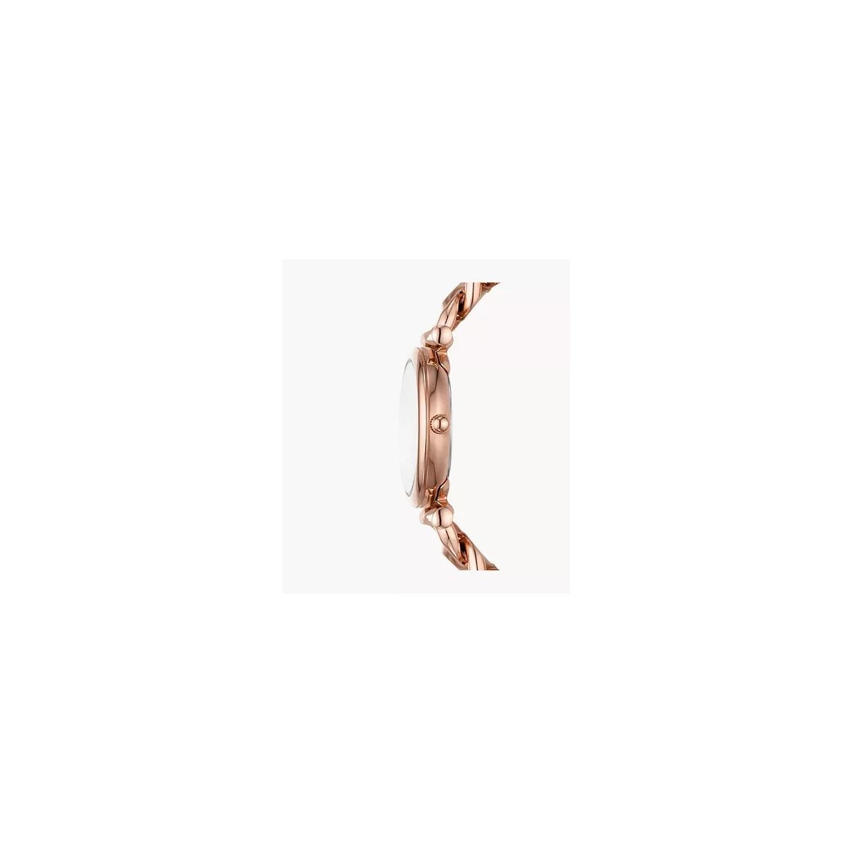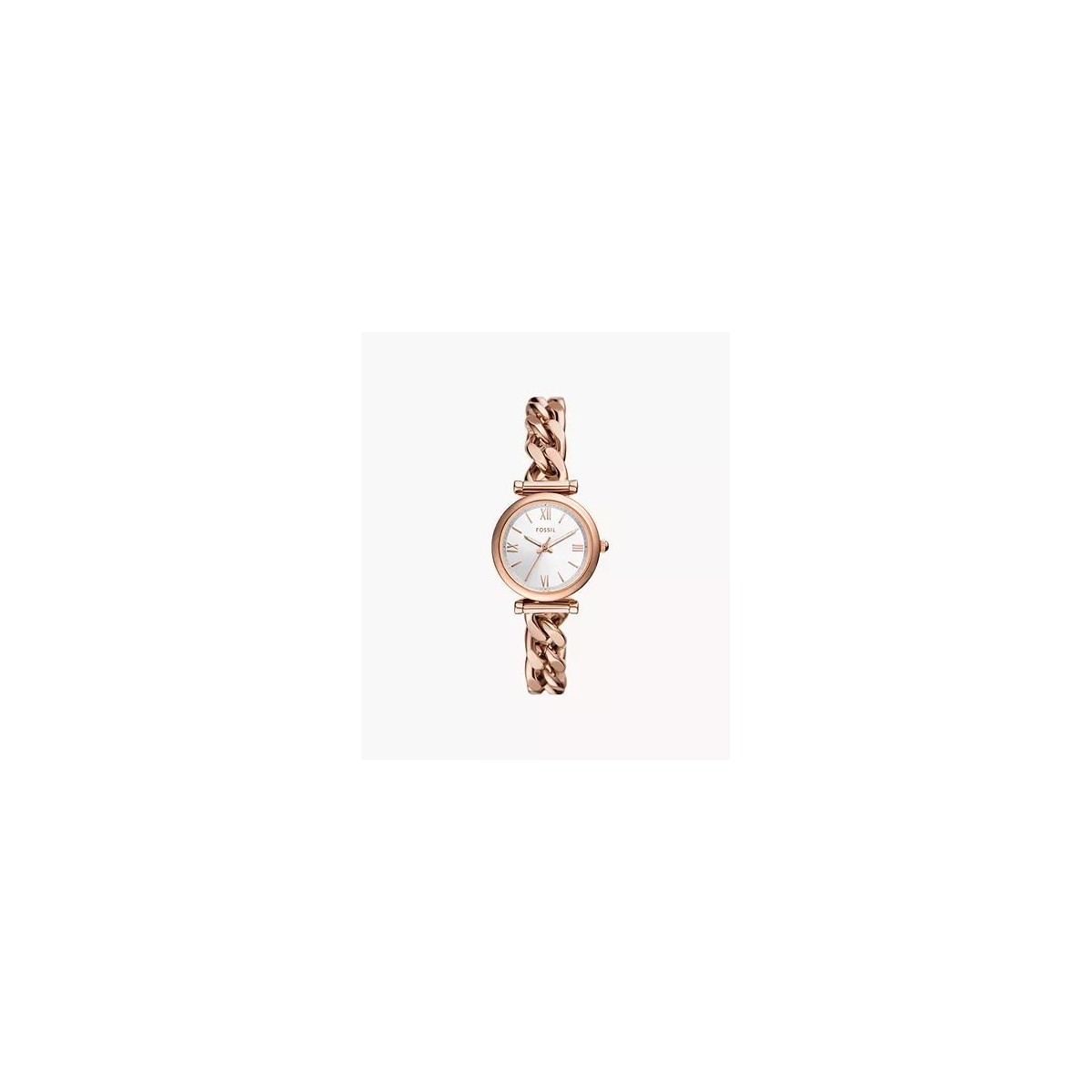 Passe-partout, notre collection Carlie allie un style décontracté et une pointe de sophistication. Avec une barre T inspirée des années 1990 remise au goût du jour et un nouveau design de bracelet époustouflant, cette montre présente un boîtier rond en acier inoxydable doré rose de 28 mm et un cadran soleillé argenté avec des aiguilles lumineuses, des chiffres romains et des index bâtons.