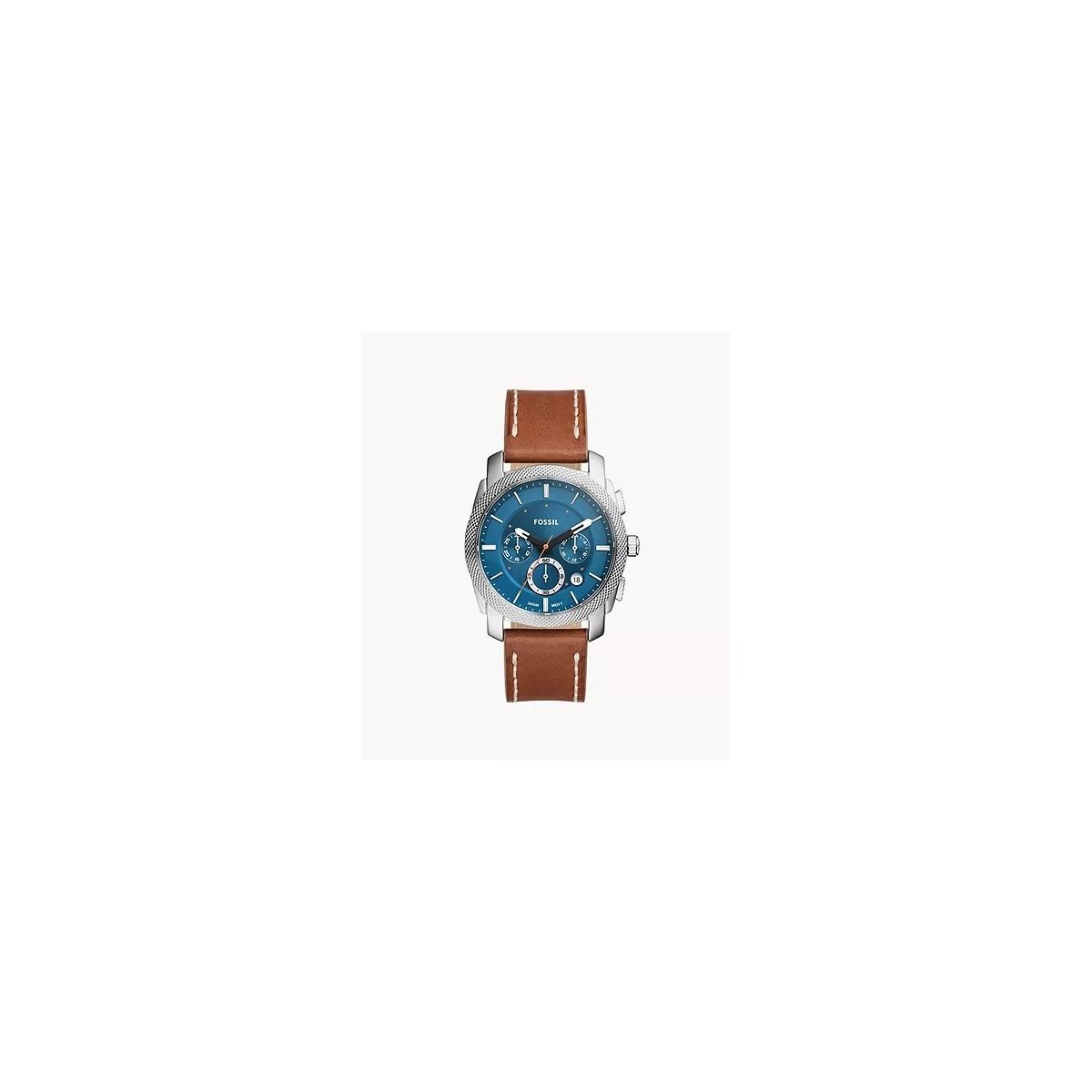 Cette montre Machine de 42 mm présente un cadran texturé satiné bleu, un mouvement chronographe et un bracelet en cuir marron.