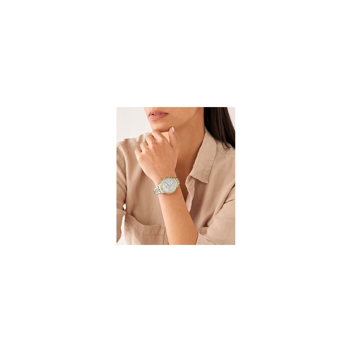 Cette montre Neutra de 36 mm est dotée d'un cadran nacré brillant, d'un mouvement chronographe et d'un bracelet en acier inoxydable bicolore.