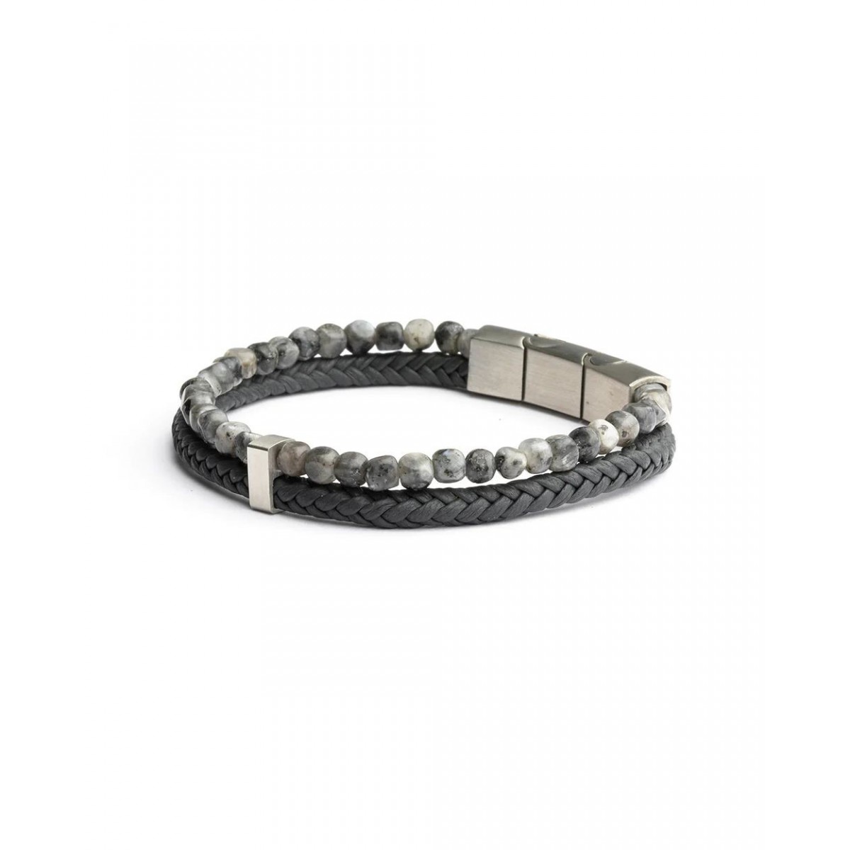 Le cuir gris utilisé pour ce Double Grey est vraiment exceptionnel : il est tissé à la main en Toscane, en Italie. Vous sentirez clairement la différence avec n'importe quel type de cuir que vous avez déjà essayé. Le bracelet est fini avec des pierres Larvikite de 4 mm de Norvège. Cette pierre est idéale pour se protéger des mauvaises influences, aborder les choses sous un angle supérieur et redonner au corps sa force et sa vitalité.