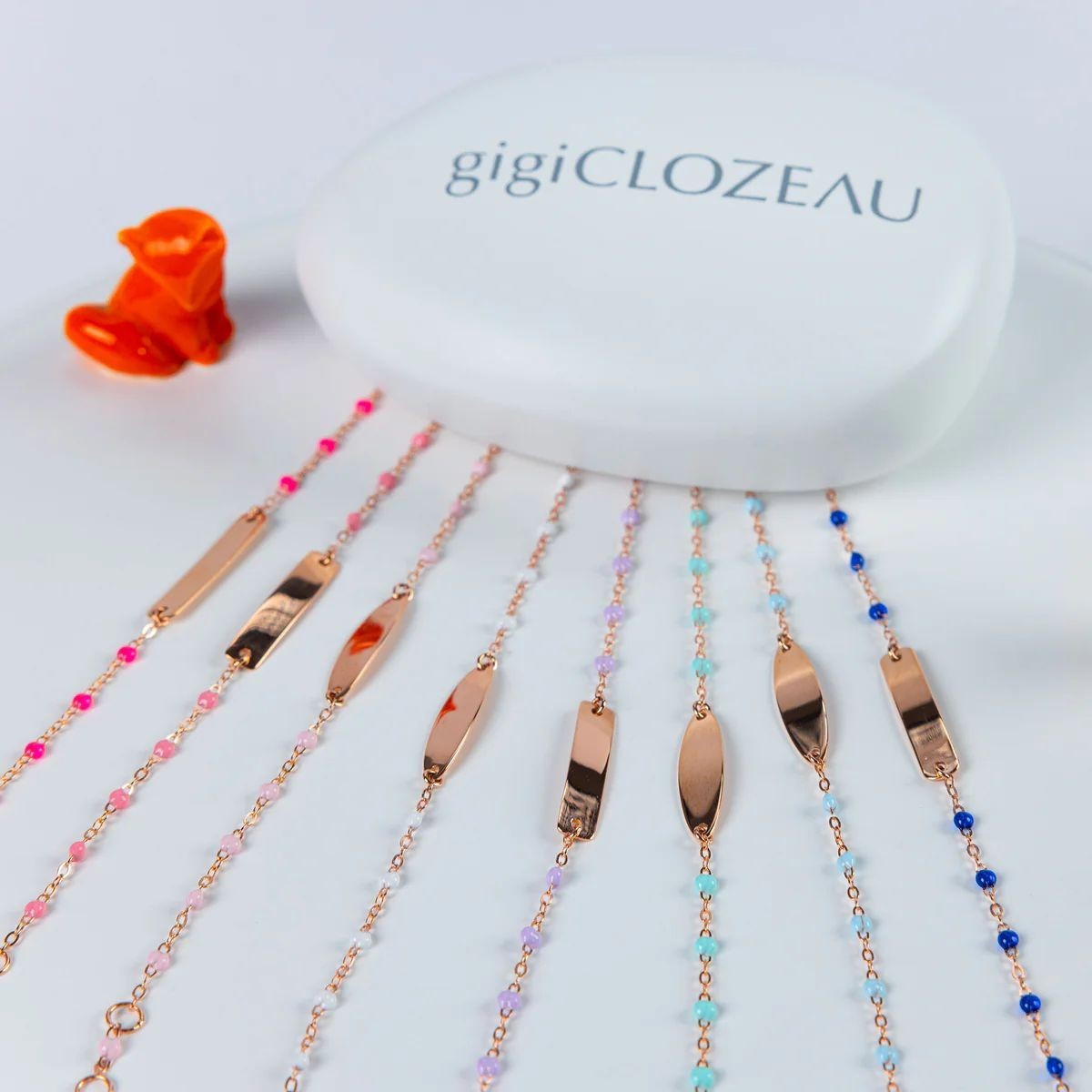 Bracelet enfant gigi CLOZEAU en or rose 18 carats et perles de résine. Un bracelet avec une plaque ovale qui peut être gravée. Dimensions de la plaque : 1,8 cm x 0,4 cm