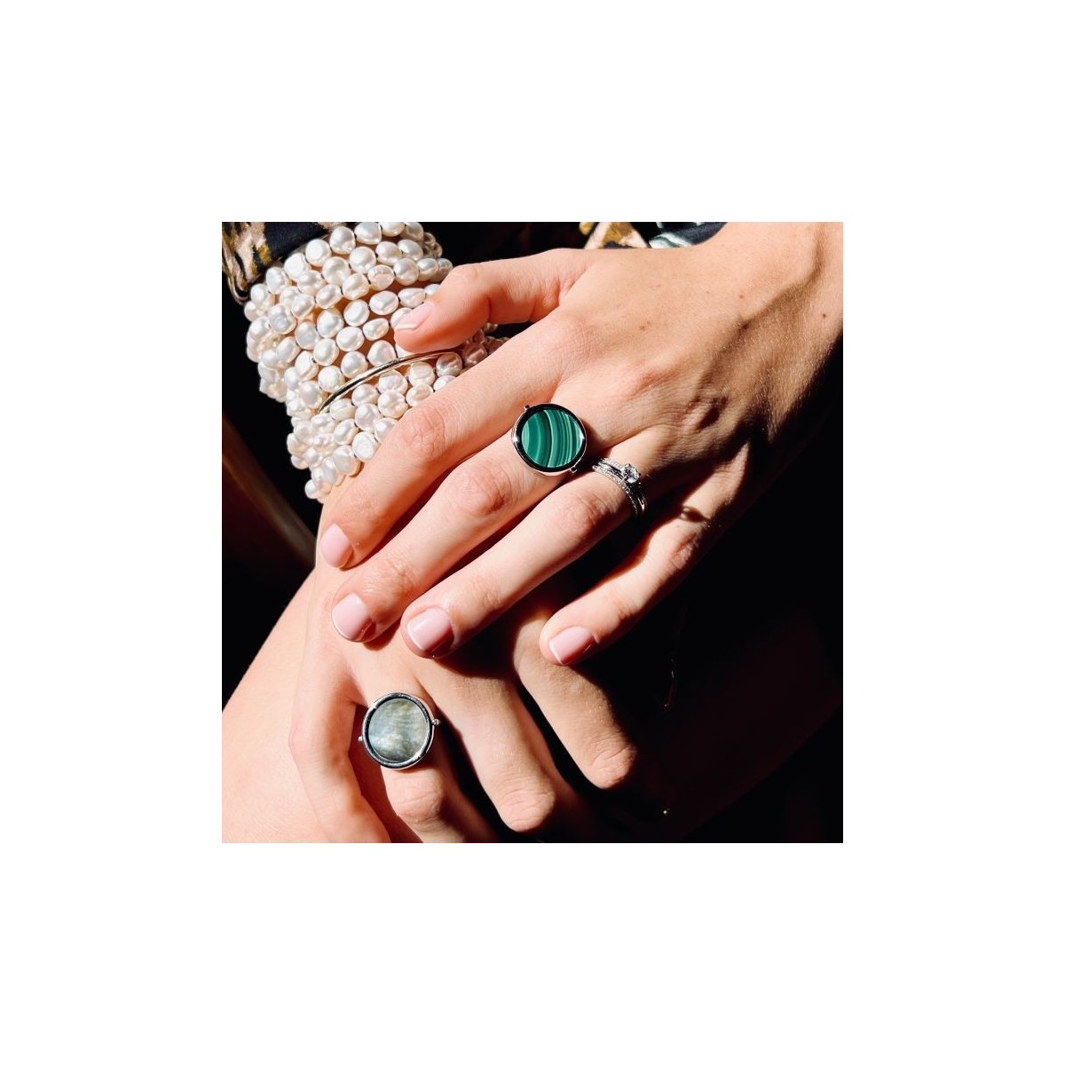 Bague or blanc 18 carats et malachite.