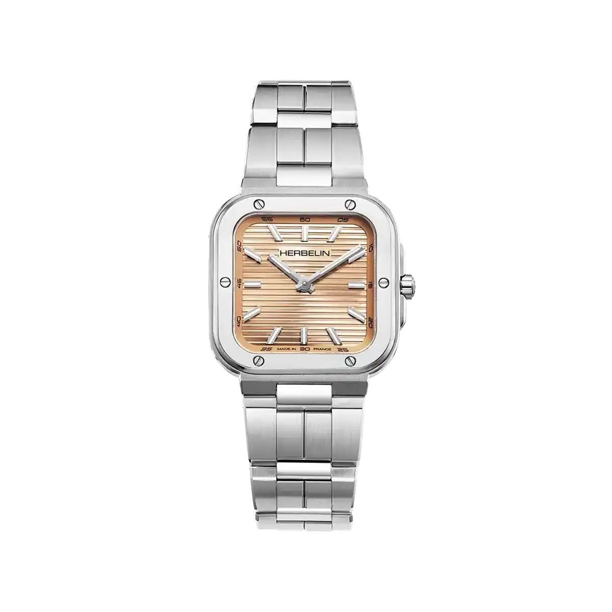 Le modèle CAP CAMARAT Square Champagne Rosé s'affirme comme l'accessoire parfait pour celles qui cherchent à allier un esprit sportif à une touche urbaine. Son format carré, accentué par une lunette décorée de six vis, confère au modèle une originalité et une forte personnalité. Cette pièce, emblématique de la ligne Cap Camarat, arbore un bracelet en acier inoxydable brossé et poli, évoquant une élégance dynamique et contemporaine.