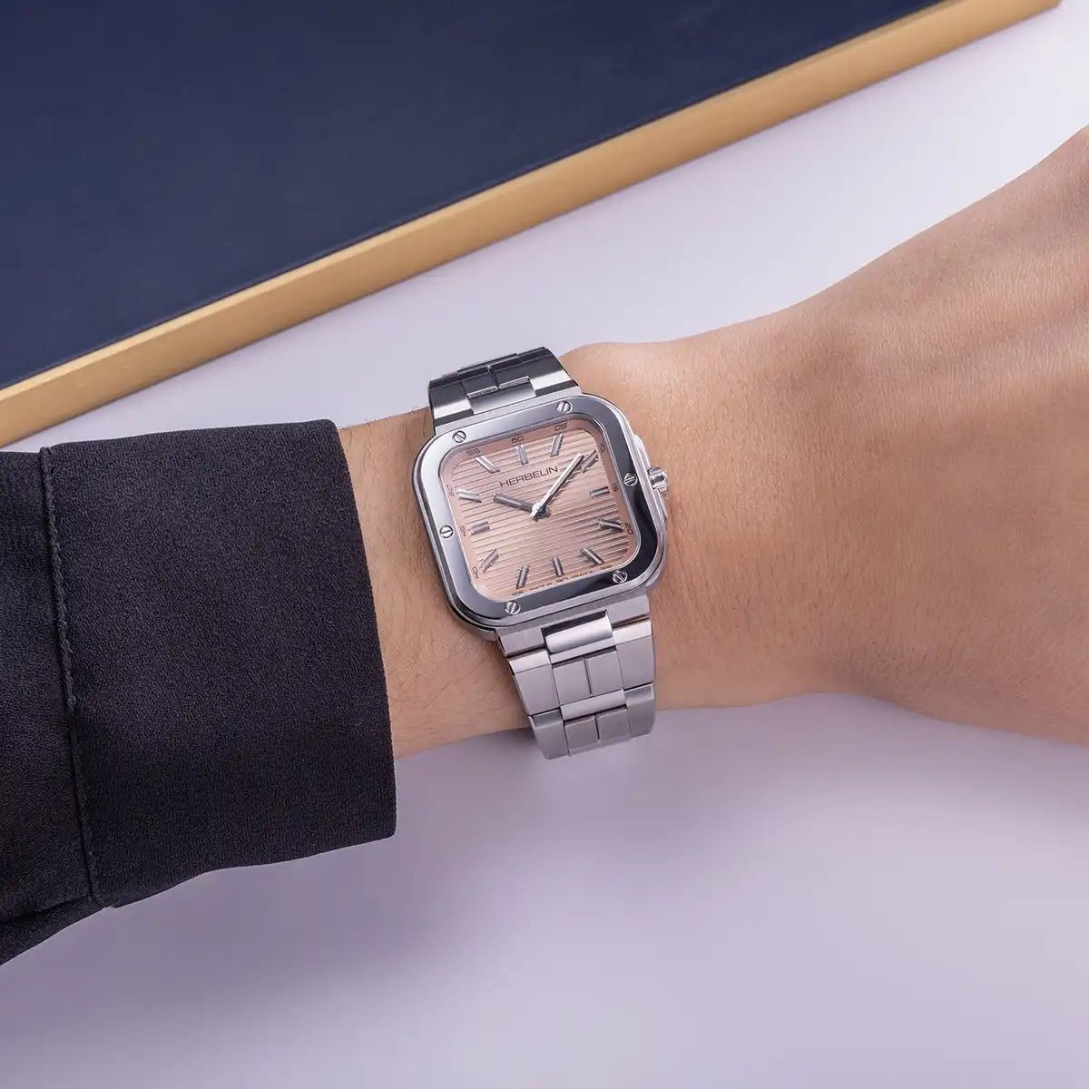La couleur orange champagne rosé du cadran, frappé à l'horizontale, laisse transparaître énergie et optimisme. Cette teinte chaleureuse et lumineuse assure à cette montre une capacité unique à s'adapter à diverses occasions : réunions professionnelles ou sorties décontractées.