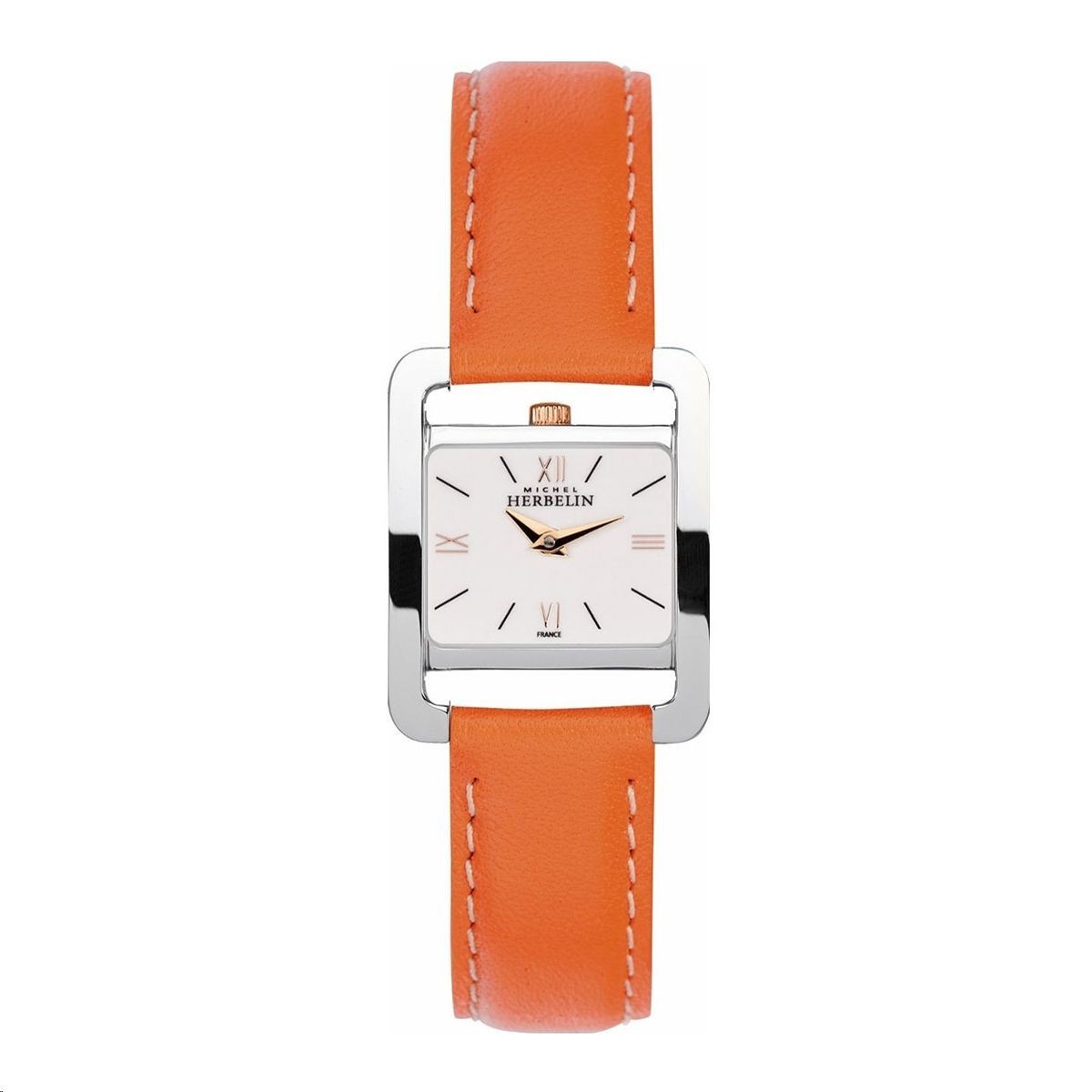 Cette montre femme Michel Herbelin Inspiration se compose d'un bracelet en cuir marron surpiqué blanc - d'un boitier rectangulaire acier et d'un cadran blanc avec un affichage chiffres romains.