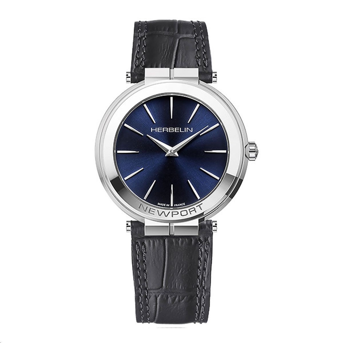 Emblématique de la maison Française, Newport arrive métamorphosée et arbore une silhouette fine et épurée. D'une épaisseur de seulement 5,85 mm c'est une première pour la Newport. Le boîtier en acier inoxydable de 40 mm de diamètre reste fidèle aux codes historiques par ses attaches centrales et sa couronne gravée d'une roue marine. Découpé en trois facettes minutieusement ciselées, sa finition polie sculpte la lumière. Ponctuée d'un cadran bleu marqué d'index argentés, cette montre est habillée d'un bracelet en cuir façon alligator. Newport Slim a été dessinée, conçue et assemblée dans les ateliers Herbelin en France.