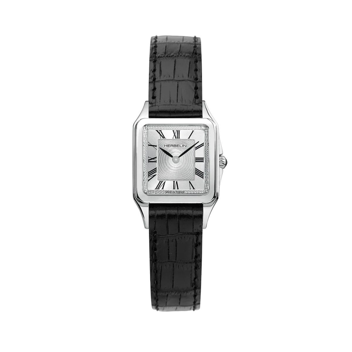 Luna est un modèle féminin qui associe élégance et sophistication. Son cadran en argent brossé guilloché est orné d'index en chiffres romains, créant un contraste harmonieux avec le boîtier en acier inoxydable. Le bracelet en cuir noir apporte une touche d'élégance supplémentaire à cette montre, complétant parfaitement son esthétique globale. Luna incarne le style classique et intemporel associé à la marque Herbelin.