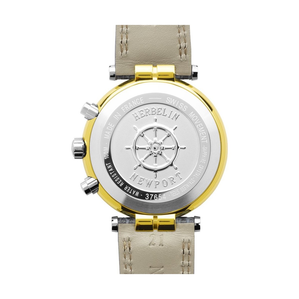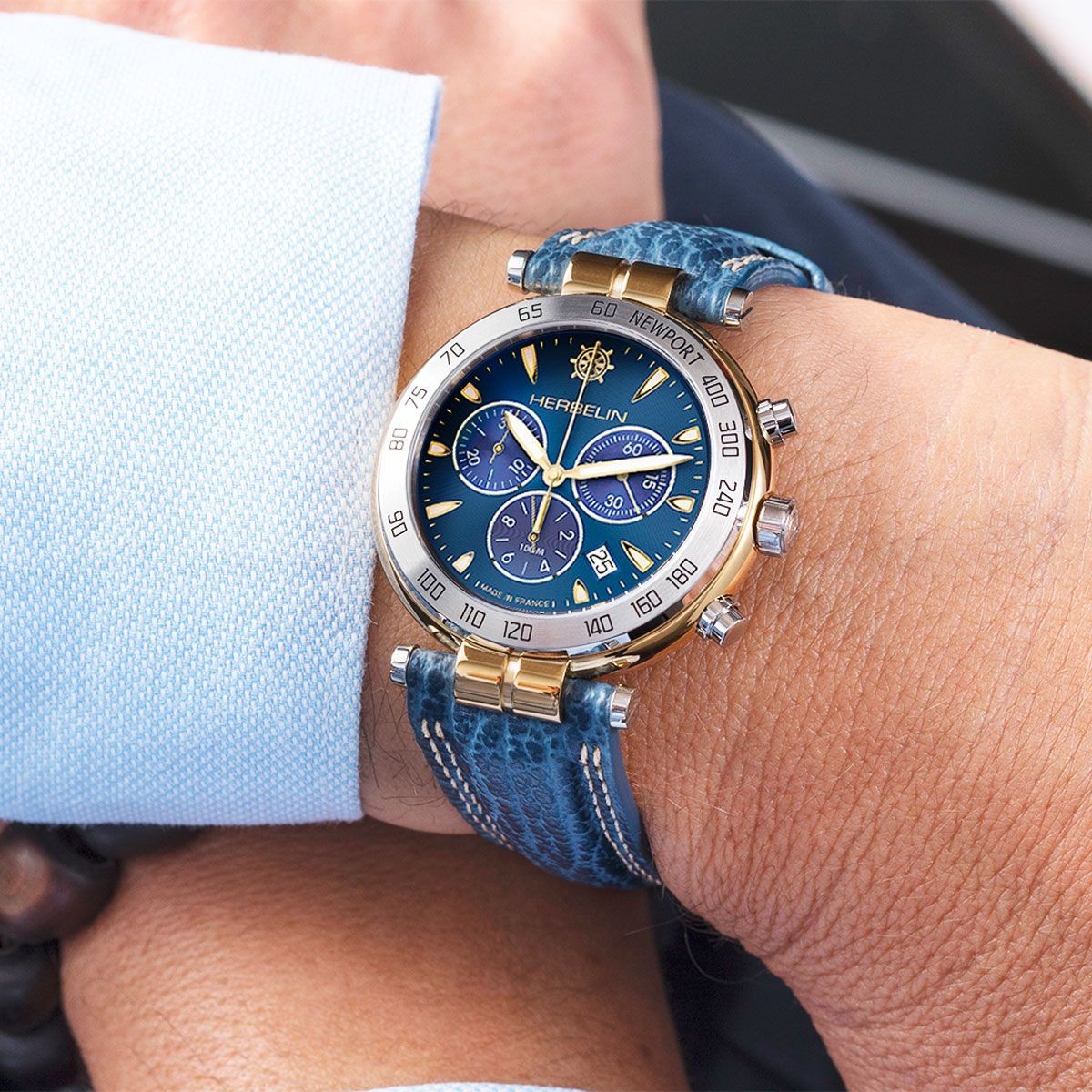 Inspirée par les hublots de navires transatlantiques et dotée d'une forte personnalité, Newport est le modèle emblématique de la Maison Herbelin. Cette montre Newport est singulière de par ses attaches et l'alliance du PVD or jaune et de l'acier habillant son boitier. Son cadran bleu intense marqué d'une roue de marine à midi rend cette pièce Herbelin unique. Elle habille les courbes des poignets masculins avec distinction.