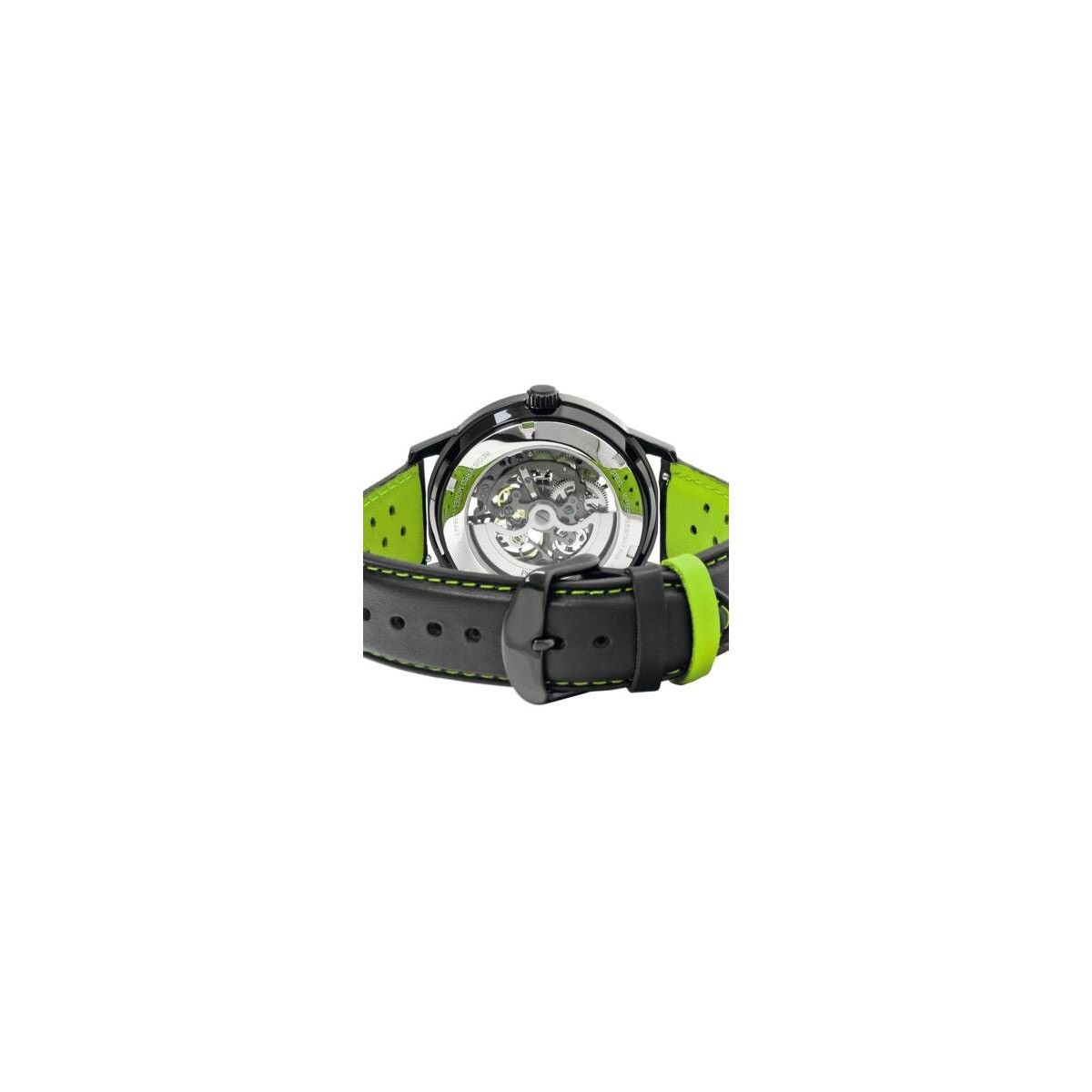 La Montre automatique Paddock 341A477, dans sa déclinaison verte. Son cadran squelette avec étrier de frein décoratif vert vif et son bracelet en cuir perforé aux surpiqures et doublures vertes lui confère son allure sportive et originale !