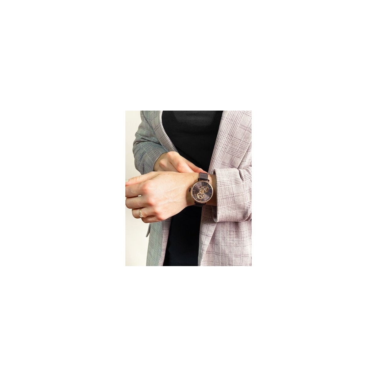 Les ouvertures rondes de la montre Femme Mélodie 348A739 laissent apparaître les parties du mécanisme en mouvement perpétuel. Ce cadran cœur ouvert, dit aussi cadran squelette apporte beaucoup de charme et de performance à ce modèle automatique pour femmes.