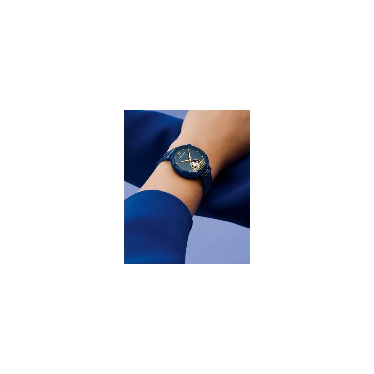 Fabriquée en France, cette montre bleue fascine avec son cadran aventurine bleu, sa couronne décalée à 2h et son élégant bracelet milanais assorti.