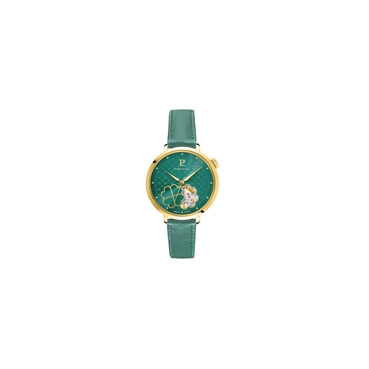 La montre automatique femme Espérance 147K577 se distingue par son cadran vert émeraude décoré de trèfles. Son boîtier doré et son élégant bracelet en cuir vert créent une harmonieuse alliance de couleurs.