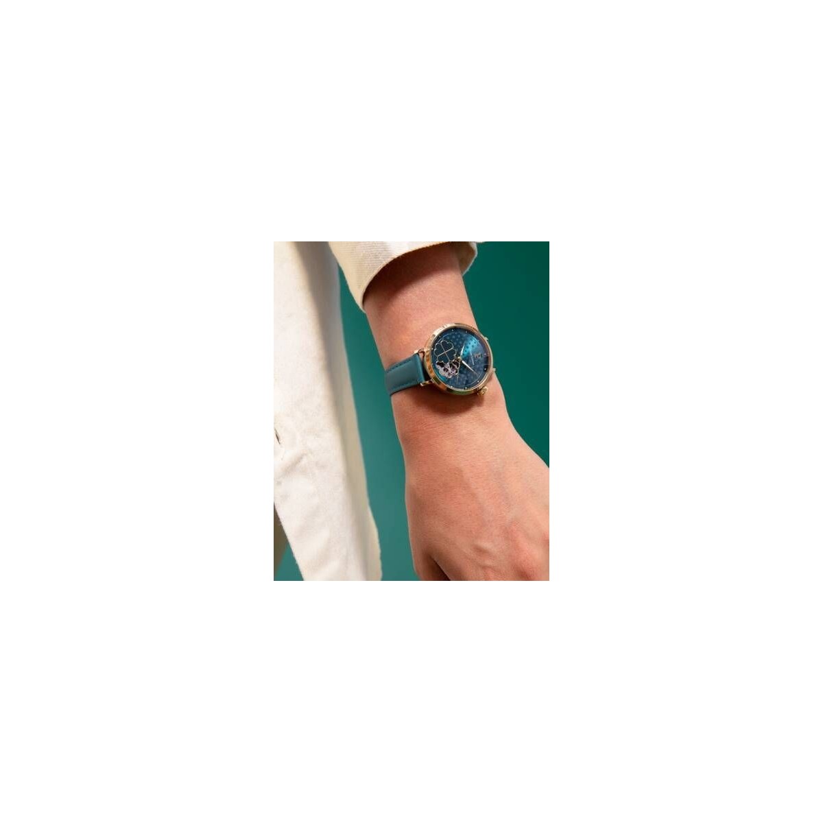 Le boîtier doré de 35 mm et sa couronne placée à deux heures, rehausse le design, tandis que le bracelet en cuir vert de 14 mm dotée de pompes rapides apporte du confort et du style. Les aiguilles et index dorés apportent une touche éclatante qui attire le regard.