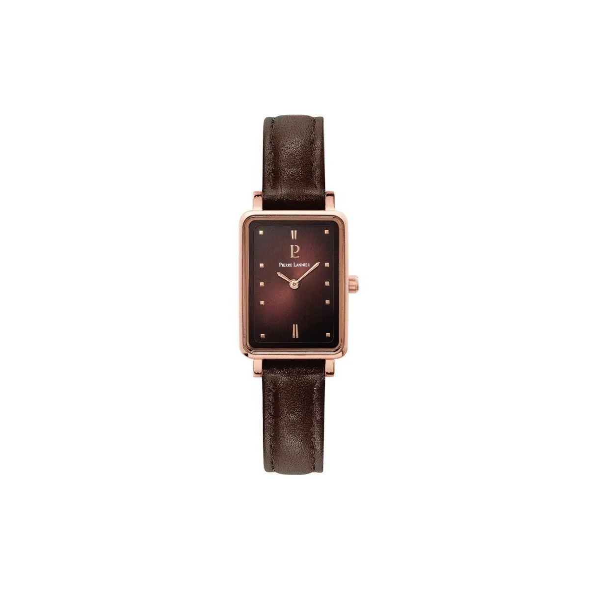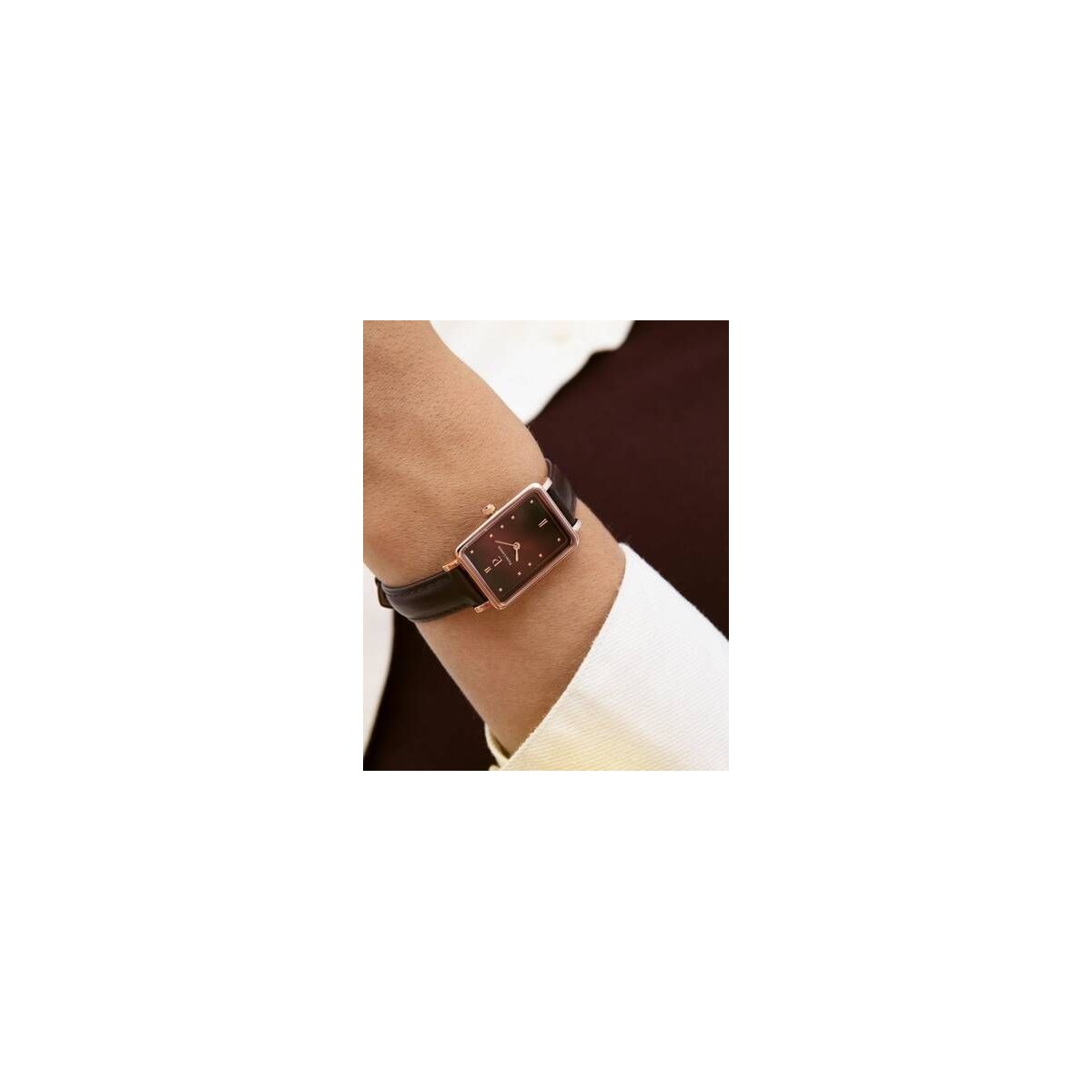 Elle est dotée d'un boîtier rectangulaire en acier doré rose de 21x28,40 mm, d'un cadran soleillé chocolat avec des index et des aiguilles dorés roses. Cette déclinaison moderne et élégante de l'indémodable Ariane vous accompagnera avec style durant la saison automne-hiver.
