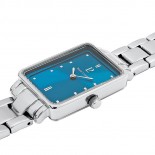 Cette montre se distingue par son boîtier rectangulaire en acier inoxydable doré de 21 mm x 28,4 mm, d'une épaisseur de 6,20 mm aux coins légèrement arrondis. Son cadran bleu à l'effet soleillé offre un contraste charmant avec les index et aiguilles argentés.