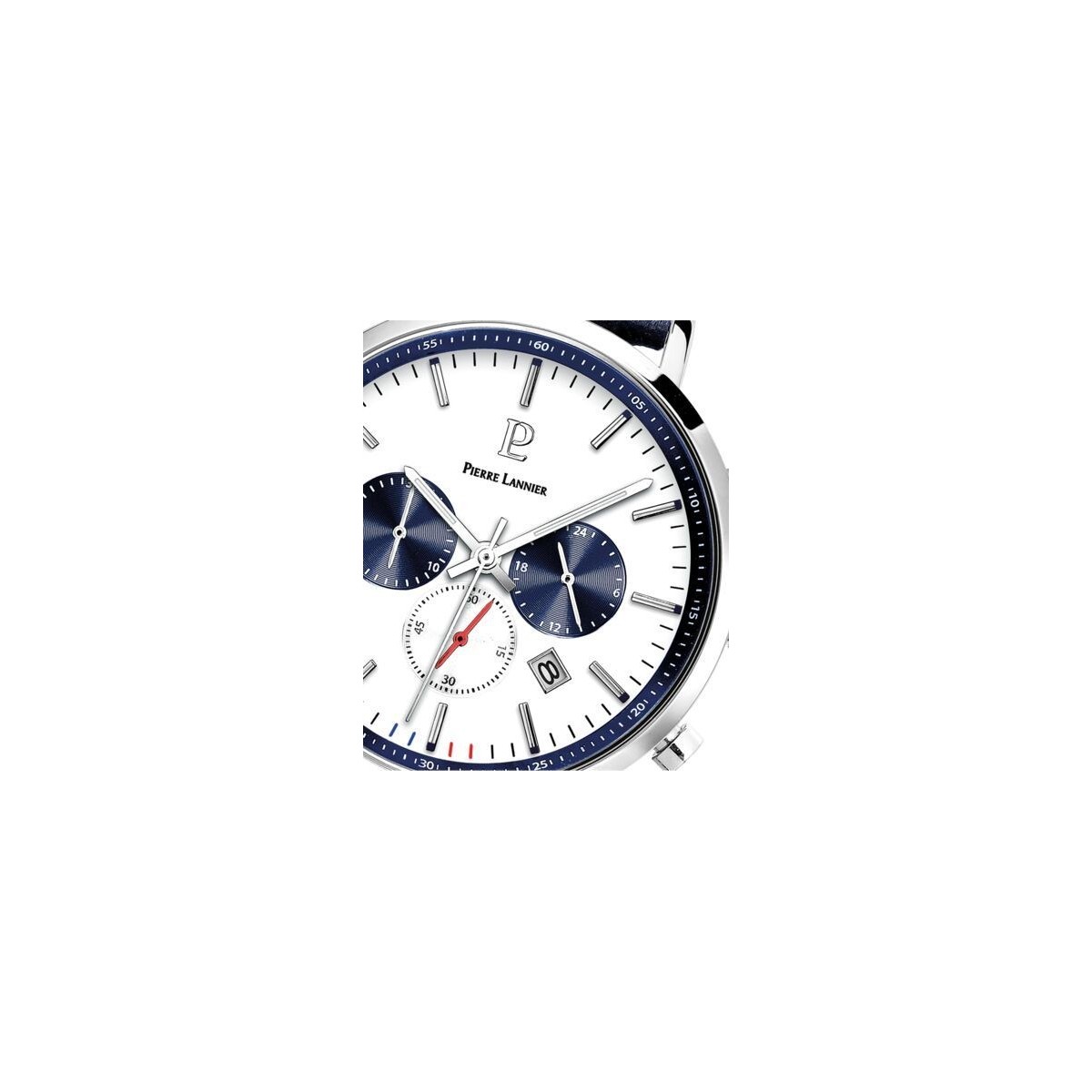 Le boîtier rond en acier, mesurant 43 mm de diamètre, confère à cette montre une allure à la fois robuste et sophistiquée. Sur le côté droit du boîtier, la couronne et les deux poussoirs ajoutent une touche de distinction et permettent d'activer les compteurs qui ornent le cœur du cadran blanc. Ces trois compteurs, magnifiés par un effet soleillé, affichent avec précision les fonctions chronographes, tandis qu'un dateur pratique vous rappelle la date du jour. Les index argentés et la trotteuse rouge vif assurent une lisibilité exceptionnelle en toutes occasions.
